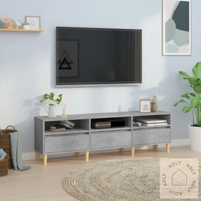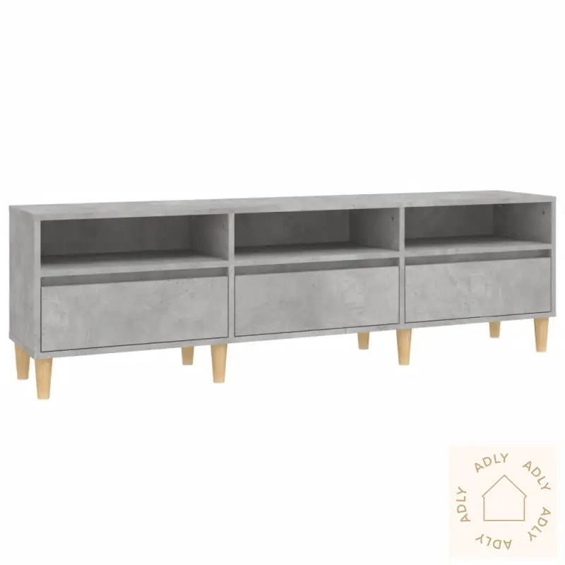 Slitesterkt materiale: Det konstruerte treverket holder høy kvalitet, har en jevn finish og tåler både daglig bruk og fuktighet – så møblene dine varer lenge uten mye vedlikehold. Kombinasjonen med eukalyptustre gir ekstra stabilitet og et solid inntrykk.Rikelig lagringsplass: Med god støtte for DVD-spillere, spillkonsoller, strømmeenheter og annet tilbehør har du alltid det viktigste innen rekkevidde. Du slipper kaos i stua og får mediene dine organisert, noe som gjør TV-benken til en praktisk løsning sammen med bokhyller og stående hyller.Visningsfunksjon: Toppen av benken egner seg perfekt til favorittbilder, små dekorative elementer eller grønne planter som gir nytt liv til rommet. Med den betonggrå finishen passer benken godt inn sammen med ulike typer møbler og interiør.Farge: betonggråMaterialer: konstruert tre, eukalyptustreMål: 150 x 30 x 44,5 cm (L x B x H)Montering kreves: ja