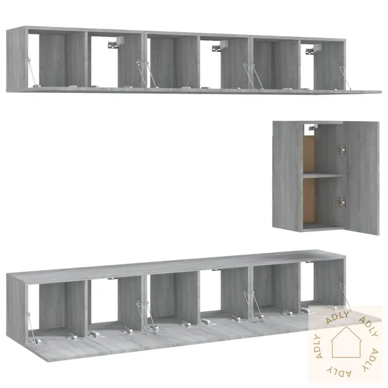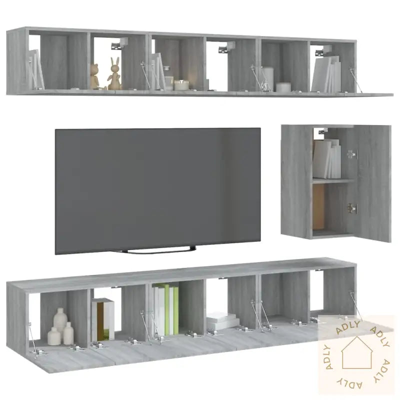 Solid materiale: Det konstruerte treverket utmerker seg med sin glatte overflate, styrke og slitestyrke. Materialet har også god motstand mot fuktighet, noe som betyr at TV-skapet holder seg pent over tid, selv i rom hvor luftfuktigheten kan variere.Rikelig med lagringsplass: Med dette TV-skapsettet får du masse plass til oppbevaring. Her kan du enkelt organisere magasiner, DVD-er og annet elektronisk utstyr, slik at alt har sin faste plass og rommet ditt fremstår ryddig og velholdt. Dette gjør det til et smart valg blant møbler til hjemmet.Veggmontert design: Skapene monteres på veggen, slik at du slipper å bruke verdifull gulvplass. Dette gir rommet en luftigere følelse og gjør rengjøringen lettere. Det enkle, flytende designet passer perfekt til moderne interiørstiler.Merk: