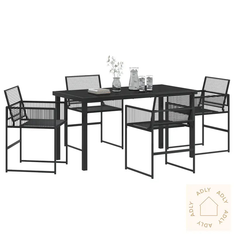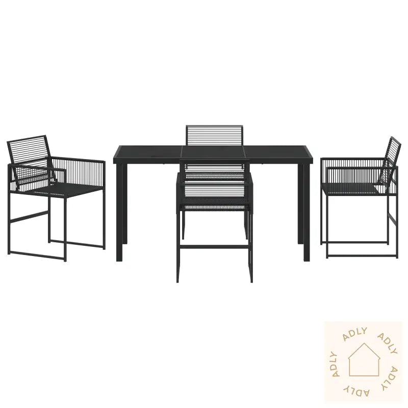 Antall Gjenstander: 5Farge: SvartForm: RektangulærMateriale: Syntetisk poly rotting som gir både slitestyrke og et tidløst utseende – perfekt for hagemøbler.Finish: Pulverlakkert stål, noe som beskytter mot rust og gir ekstra stabilitet året rundtInnendørs/Ute: Kun egnet for utendørs bruk, slik at du får møbler til hjemmet som tåler vær og vind.Trekk Inkludert: NeiRom: Garten und TerrasseBatterier Inkludert: NeiHodegavl Inkludert: NeiMaksimal Antall Personer: 4Maksimal Vekt: 110 kg per stol, så de er solide og trygge selv ved bruk over tid.Benhøyde: 44 cm som gjør det behagelig å sitte lenge, enten til fest eller en rolig kveld.Sittedybde: 38 cm for god støtte og komfort.Sittekapasitet: 1 per stolGynger: NeiStige: NeiMerke: vidaXLLeveransen Inneholder: 4 robuste hagemøbler som enkelt kan stables eller plasseres akkurat der du vil.Montering Påkrevd: Ja, men det er raskt å sette sammen, og du trenger bare én person.Anbefalt Antall Personer for Montering: 1