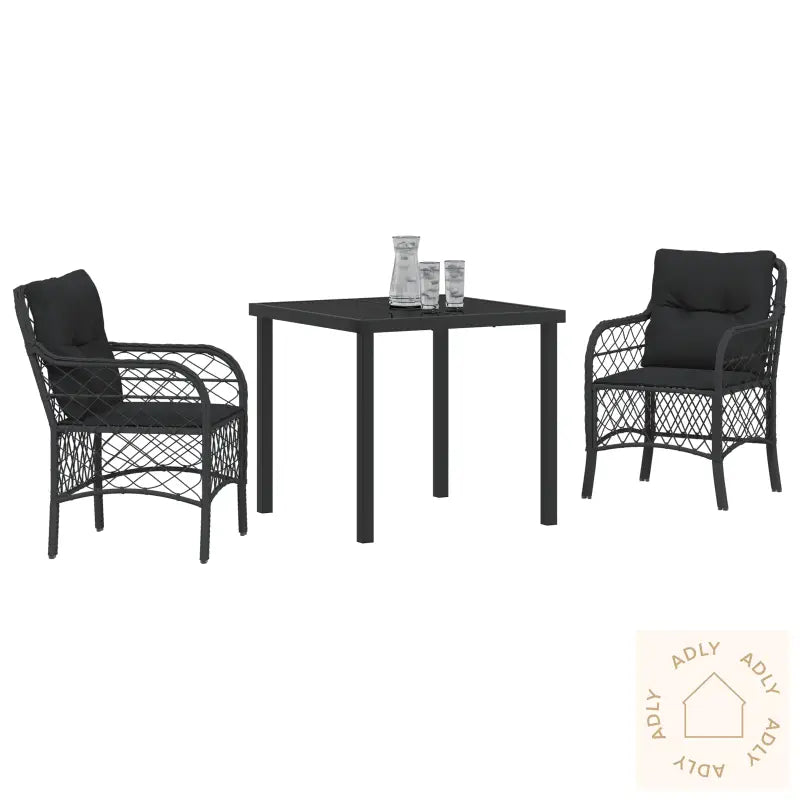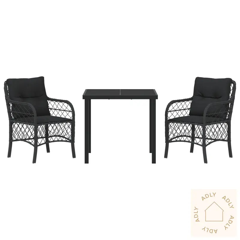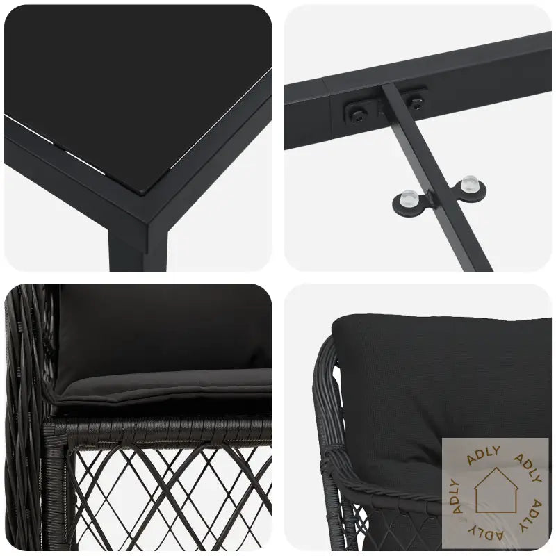 Antall elementer: 3Farge: SvartForm: RektangulærMateriale: Syntetisk poly-rottingFinish: PulverlakkertInnendørs/Ute: Kun utendørsTrekk inkludert: NeiRom: Hagen og terrasseBatteri inkludert: NeiHodegavl inkludert: NeiKapasitet: 2Maksimalt antall personer: 2Maksimal vekt: 110 kgBenhøyde: 42 cmSittedybde: 51 cmSittekapasitet: 1Gynger: NeiStige: NeiMerke: Leveransen inneholder: 2 x stol, 1 x bordMontering nødvendig: JaAnbefalt antall personer for montering: 2