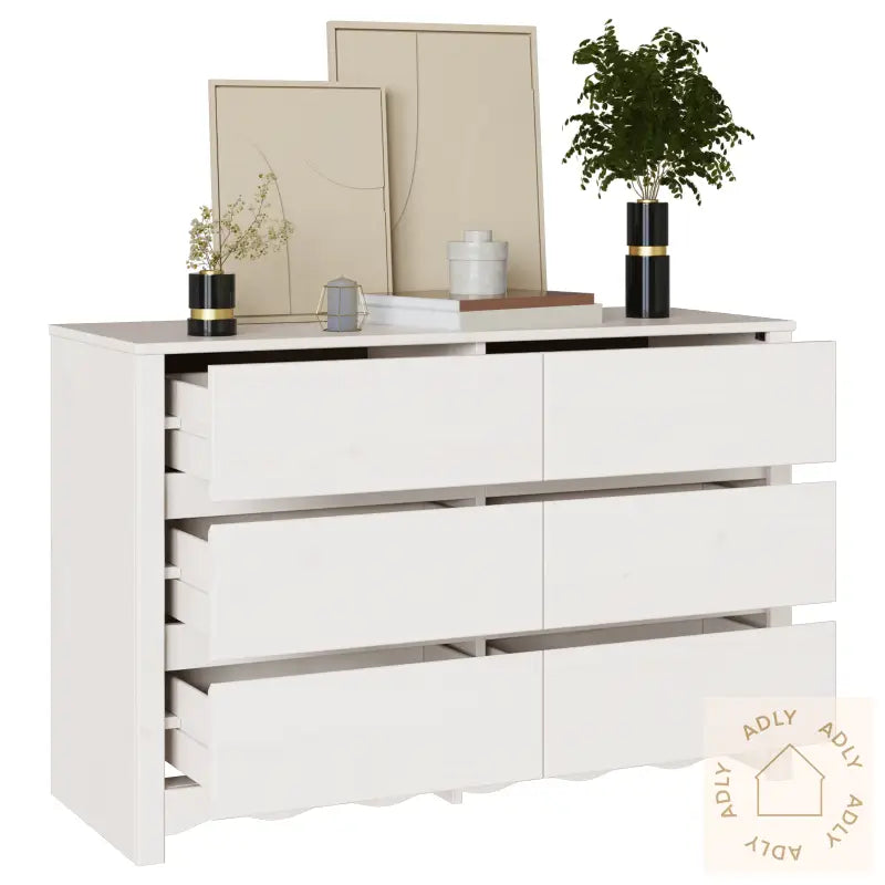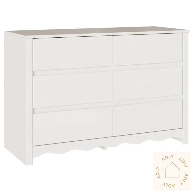 Farge: Hvit Form: RektangulærMateriale: Naturlig treOverflate: Matt Innendørs/Ute: Bare innendørsDeksel inkludert: NeiRom: SoveromBatterier inkludert: NeiStige: NeiMerke: Levering inneholder: Kommode med 6 skufferMontering kreves: JaAnbefalt antall personer for montering: 2