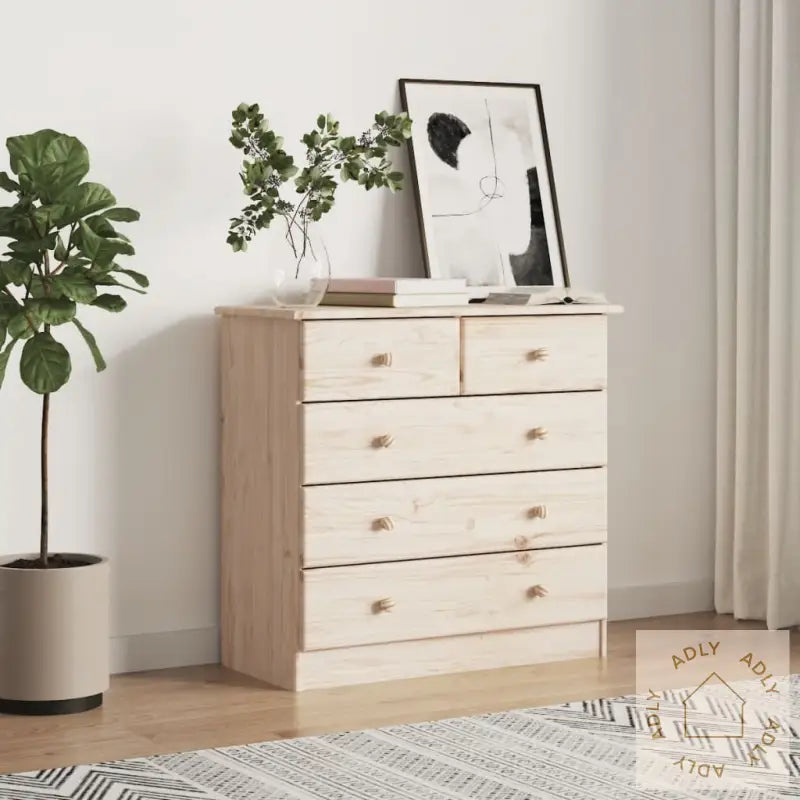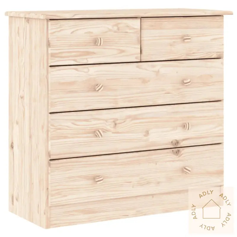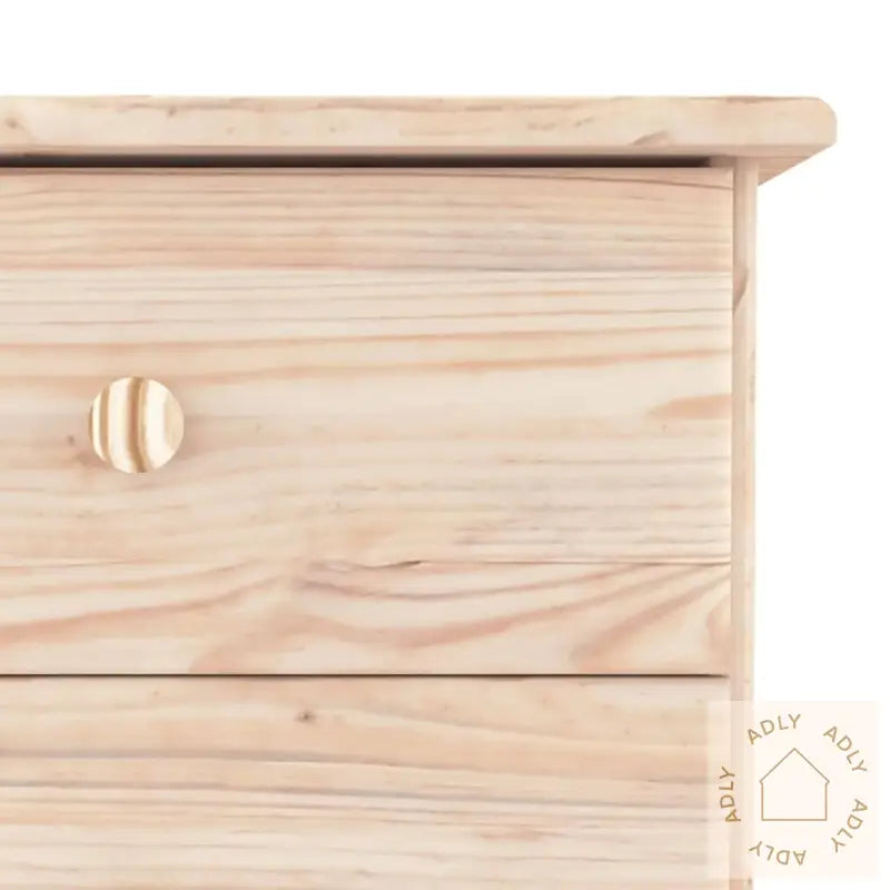 - Heltre furu: Kommoden er laget av heltre furu – et naturlig og vakkert materiale kjent for sin rette årringstruktur og dekorative knuter, noe som gir det et unikt og rustikt preg. Dette gjør møbelet både solid, slitesterkt og til et flott blikkfang i rommet.