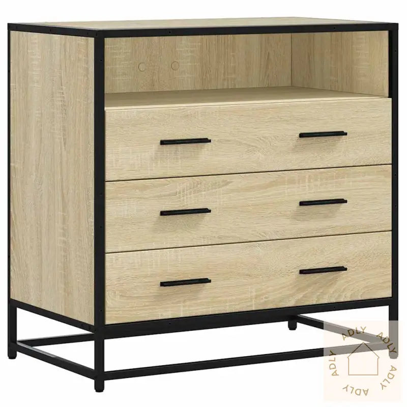Stabil og langvarig ramme: Metallrammen forskjønner interiøret med sin industrielle look, og gir eksepsjonell holdbarhet og stabilitet. Metall motstår dessuten korrosjon og gjør denne kommoden til et solid møbelvalg.Stabilt og slitesterkt materiale: Konstruert tre er kjent for å være både slitesterkt og stabilt. Den glatte flaten er lett å holde ren, samtidig som materialet er motstandsdyktig mot fukt, vridning og sprekker – ideelt for bruk i alt fra soverom til stue.Rikelig med oppbevaringsplass: De 3 store skuffene gir deg masse plass til å organisere klær, dokumenter eller andre ting, og gjør det enkelt å holde hjemmet ryddig. Materialvalget sørger for at oppbevaringsskuffene tåler daglig bruk, og sikrer varig kvalitet.Solid topp: Nyt ekstra plass til å vise frem favorittpotteplanter, innrammede bilder eller annen dekor. Overflaten i sonoma eik gir kommoden et lunt og naturlig utseende som glir rett inn i både klassisk og moderne interiør – eller som del av en lys og trendy innredning sammen med f.eks. bokhyller og stående hyller.Enkel rengjøring: Kommoden er veldig enkel å vedlikeholde – bare tørk overflaten med en fuktig klut for å holde den pen.Advarsel: