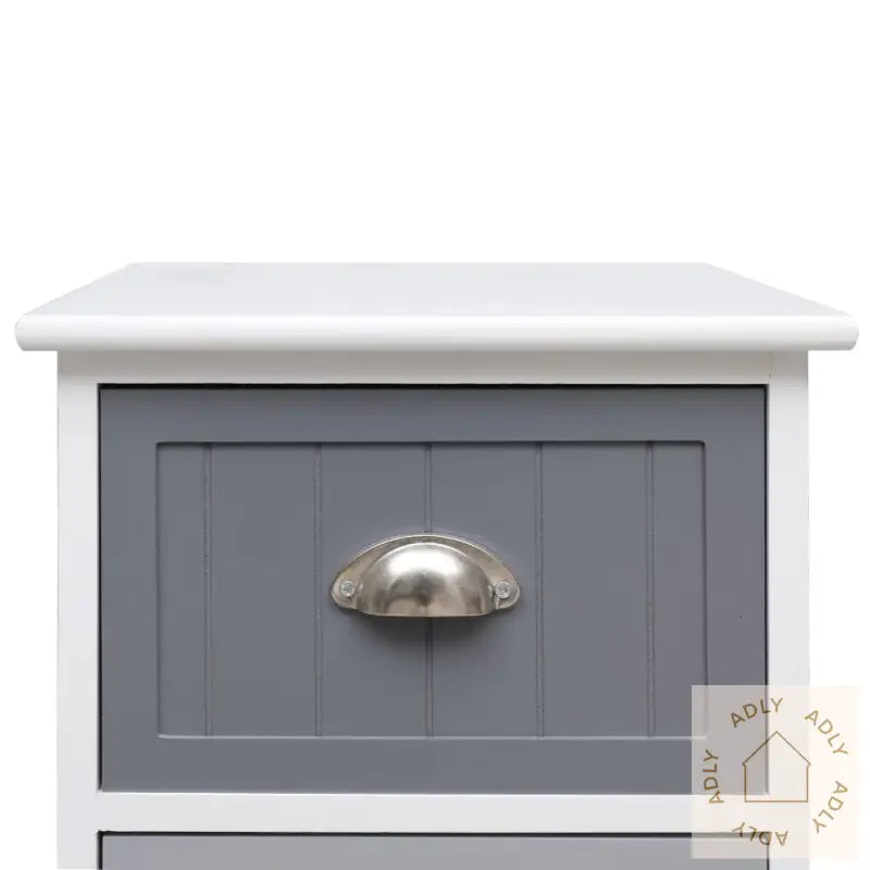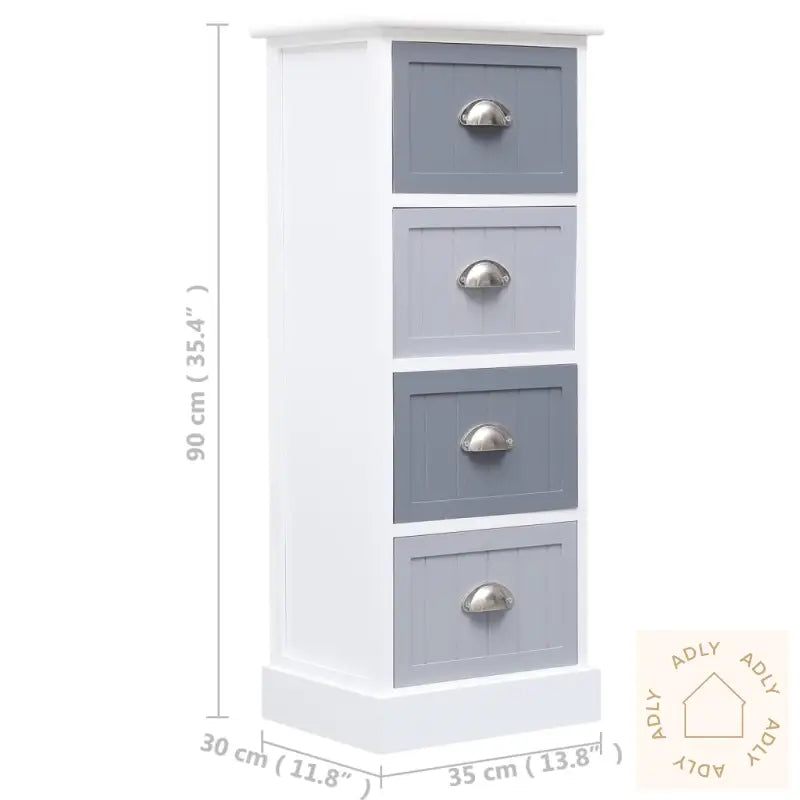 Farger: hvit og gråMaterialer: keisertre + MDFMål: 35 x 30 x 90 cm (B x D x H)Med 4 skufferMaks. lastekapasitet (totalt): 50 kgMaks. lastekapasitet per skuff: 2,5 kgADVARSEL: For å forhindre at produktet velter, må medfølgende festemidler for vegg benyttesLegal Documents: