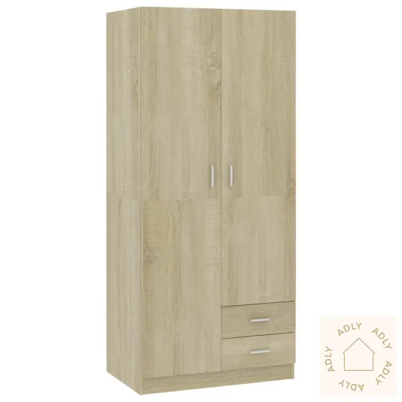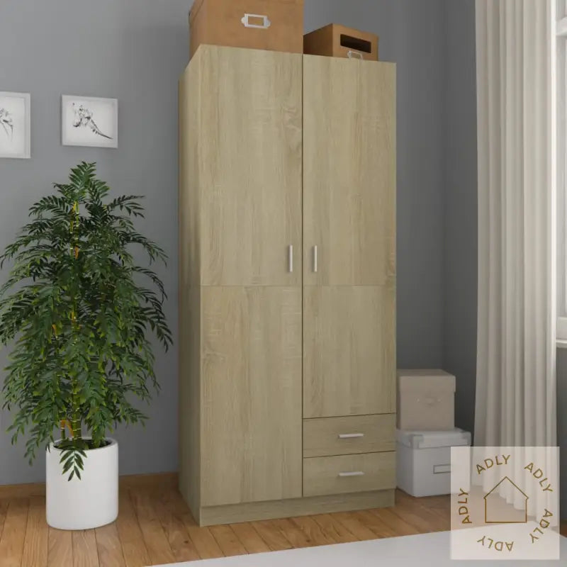 Farge: sonoma eikMateriale: konstruert treMål: 80 x 52 x 180 cm (B x D x H)Med 2 dører og 2 skufferMed et høyt rom og en hengestang på innsidenVennligst merk: Skrue(r) og plugg(er) for innsiden av veggen er ikke inkludert. Finn og bruk skru(er) og plugg(er) som passer for veggene dine. Hvis du er usikker, søk profesjonelle råd. Les og følg hvert trinn i instruksjonen nøye.