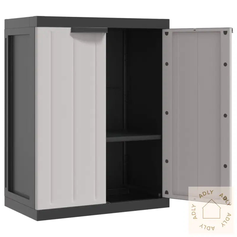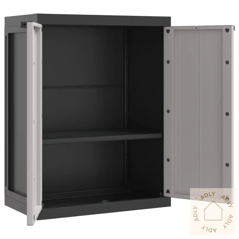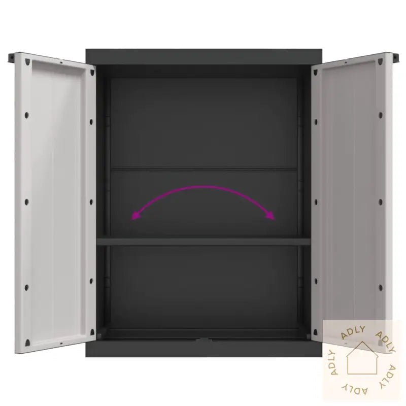 Skapet bør alltid festes med den medfølgende anordningen for å hindre at det velter, spesielt hvis det står på et ujevnt underlag eller utsettes for vind.Farger: grå og svartMateriale: 100% PP (polypropylen)Mål: 65 x 37 x 85 cm (L x B x H) – gir deg god oppbevaringsplass uten å ta opp for mye romMål hylle: 63 x 31 cm (L x B), enkel å justere i høyden for ulike typer lagringHylle justerbar hver 13. cm – gir fleksibilitet etter behovMaksimal lastekapasitet hylle: 20 kgMontering krevesLegal Documents: