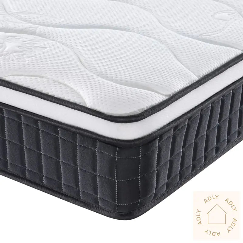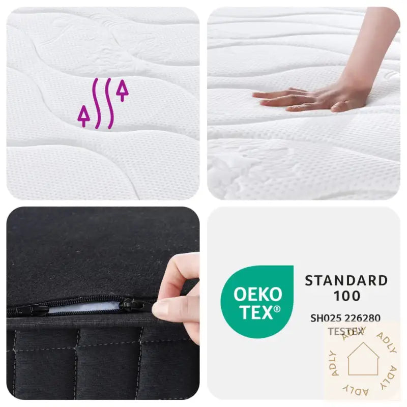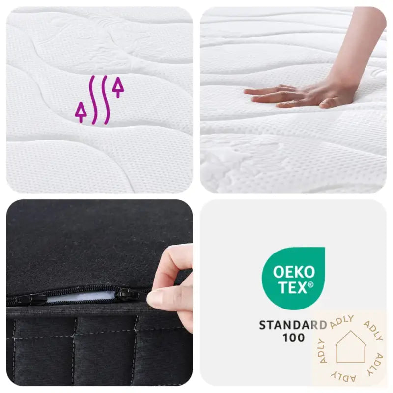 For enkelhets skyld er madrassen komprimert og rullet i en kompakt boks, så du kan frakte og montere den i hjemmet ditt uten besvær – en praktisk løsning når du handler nye møbler.Farger: H, mørkegrå og svart – matcher enkelt med andre møbler eller hagemøbler.Materiale: Stoff (100% polyester) Fyll: Bonellfjærer, skum, isolasjonsputeMål: 90 x 200 x 23 cm (B x L x T)Hardhet: Middels, balanserer støtte og komfortJacquard og kviltingmønstre gir et ekstra kvalitets- og stilinntrykk