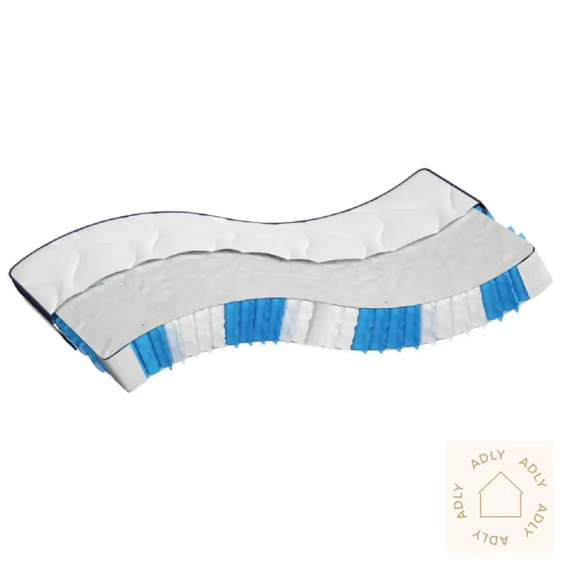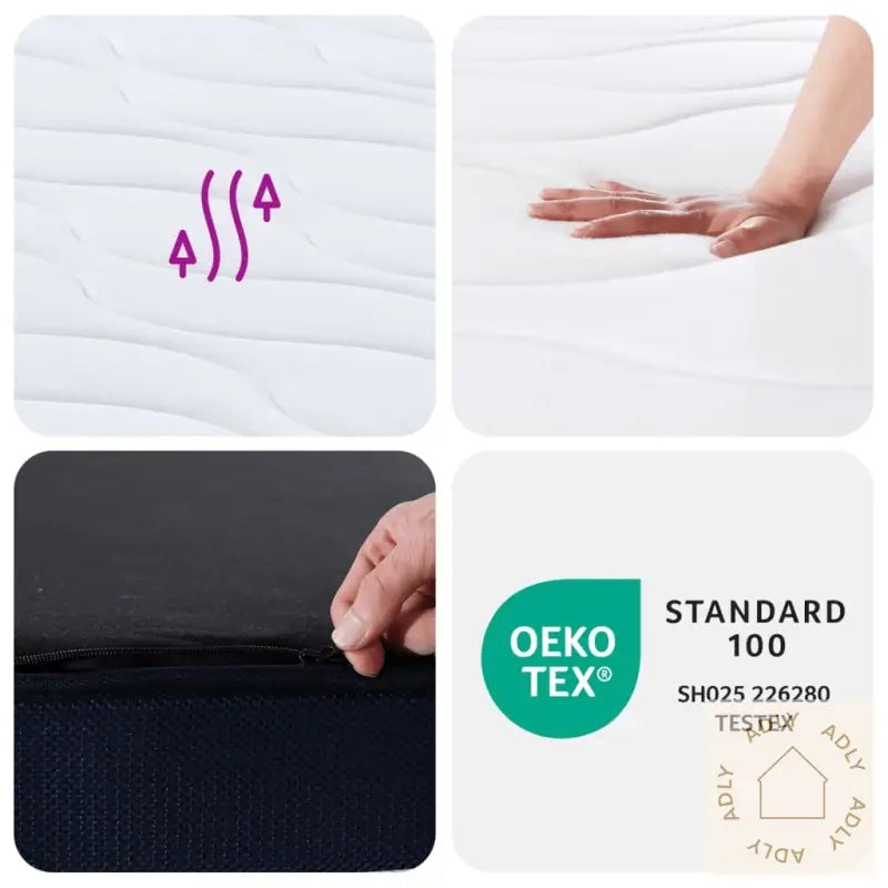 For enkel montering leveres madrassen komprimert og rullet i en praktisk boks. Det gjør det enkelt å transportere madrassen til rommet hvor du vil ha den.Farge: Hvit, blå og svartMateriale: Stoff (100% polyester)Materiale fyll: Pocketfjær, skum, isolasjonsputeMål: 140 x 190 x 25 cm (B x L x T)Hardhet: Middels fastKviltingmønstre