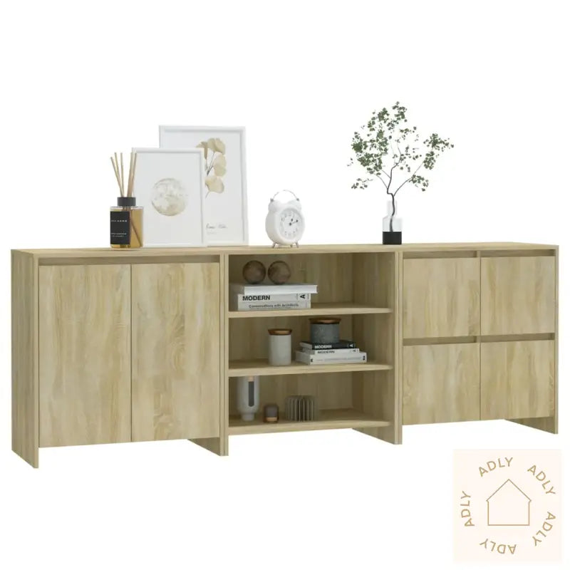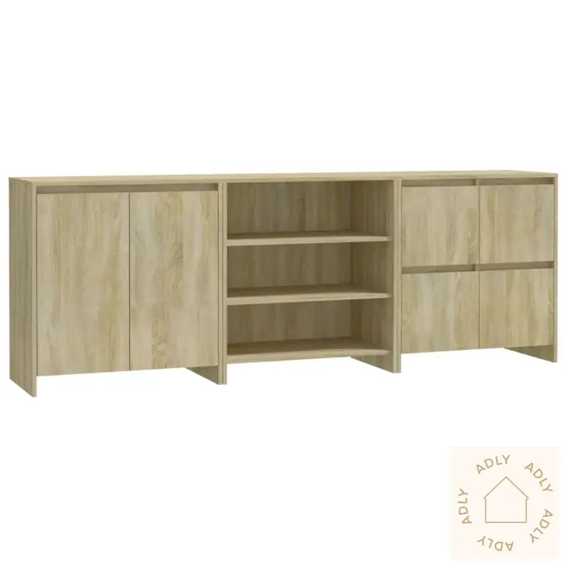 Materialet i konstruert tre gir møblene god holdbarhet og en moderne look. Overflatene er lette å rengjøre med en fuktig klut, noe som gjør skjenkene ekstra praktiske for travle hjem. Monteringen er enkel, og du får levert tre ulike varianter: én skjenk med 2 dører, én med hyller, og én med 4 dører – alle designet med praktiske mål for maksimal utnyttelse av plassen.