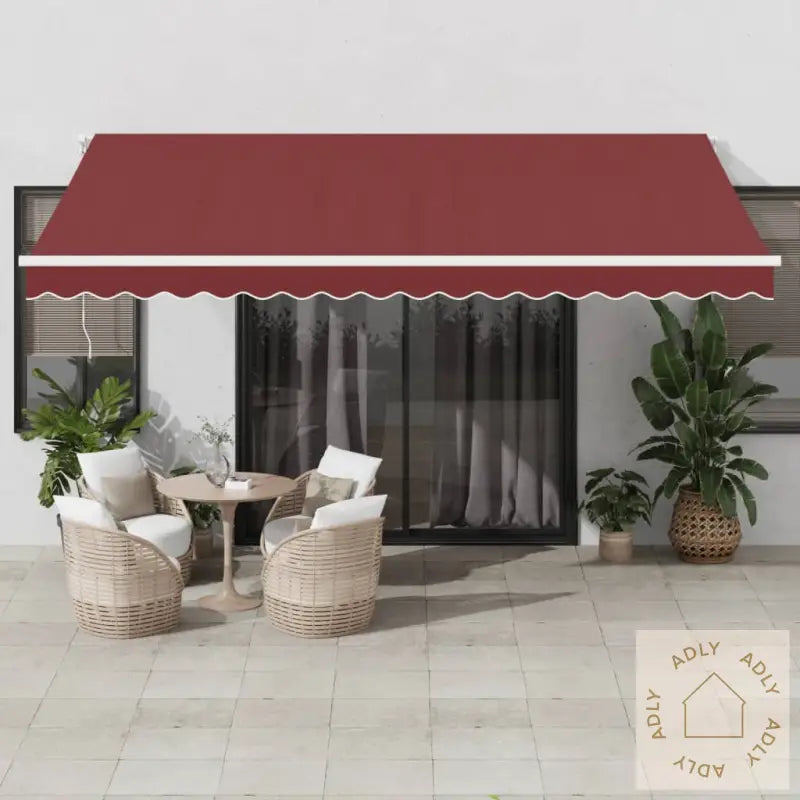 Slitesterkt materiale: Rammen til markisen er laget i pulverlakkert aluminium, noe som gir både styrke og lang levetid. Stoffet, produsert av 100 % polyester med PU-belegg, gjør at markisen tåler vær og vind, samt beskytter deg, familien og gjestene dine mot både sollys og skadelige UV-stråler – perfekt for deg som ønsker slitesterke og vedlikeholdsvennlige hagemøbler eller møbler til hjemmet.Brukervennlig design: Du justerer enkelt både vinkel og høyde, slik at den uttrekkbare markisen tilpasses etter behovene dine gjennom dagen. Med den lange håndsveiven åpnes og lukkes markisen jevnt og kontrollert, slik at du raskt kan skape behagelig skygge når sola står på.Allsidig bruk: Med sitt stilrene og moderne utseende passer den uttrekkbare markisen inn på de fleste uteområder – alt fra balkonger og terrasser hjemme, til hager, kafeer, restauranter, butikker og andre kommersielle steder. Markisen gir ikke bare praktisk solskjerming, men oppgraderer også uteplassen visuelt.Stoffets farge: BurgunderRammens farge: HvitMaterialer: Pulverlakkerte aluminiumsprofiler og polyesterstoff (100 %), behandlet med PU for ekstra holdbarhet.Samlet størrelse: 450 x 350 cm (L x B)Vann- og smussavvisende overflater, så rengjøringen blir enkel.Montering må utføres før bruk.