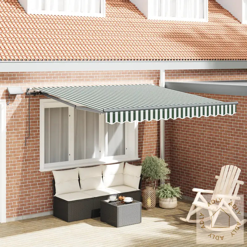 Farge: GrønnMønster: Stripete (parallell linjer i ulike bredder og farger gir et stilrent uttrykk)Form: RektangulærMateriale: Slitesterk polyester som tåler norske værforhold og beskytter mot UV-stråler.Finish: Pulverlakkert for ekstra holdbarhet og enkel rengjøring.Innendørs/Ute: Kun for utendørs bruk – ideell til terrasse eller hage.Rom: Hagen og terrassen får både skygge og en lun stemning.Kapasitet: N/AMerke: vidaXLLevering Inkluderer: Ramme til markisen følger med, så du har alt du trenger for montering.Montering Kreses: Ja, det kreves litt montering men instruksjoner følger med.Anbefalt Antall Personer for Montering: 2 – da går oppsettet raskt og greit.Med en manuell uttrekkbar markise som denne kan du enkelt justere skyggemengden etter behov, og dermed bruke uterommet ditt mer effektivt. vidaXL Manuell Uttrekkbar Markise kombinerer design og funksjon, slik at du får en løsning som gir både komfort og stil. Perfekt til alle som vil nyte mer tid ute – uansett vær!