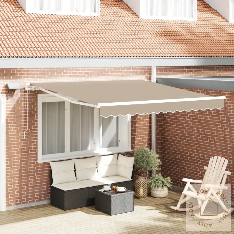 Markiseduken er laget av robust polyester med UV-resistent belegg, noe som betyr at den holder seg pen uten å falme selv etter mange solrike dager. Materialet har også vannavvisende egenskaper, så du slipper å bekymre deg for en lett regnskur. Den manuelle uttrekkbare mekanismen gjør det enkelt å rulle markisen ut og inn akkurat slik det passer værforholdene – samtidig kan du justere vinkelen for optimal skygge gjennom hele dagen. Den tidløse beige fargen matcher de fleste utemiljøer og glir rett inn sammen med dine andre hagemøbler for et helhetlig preg.