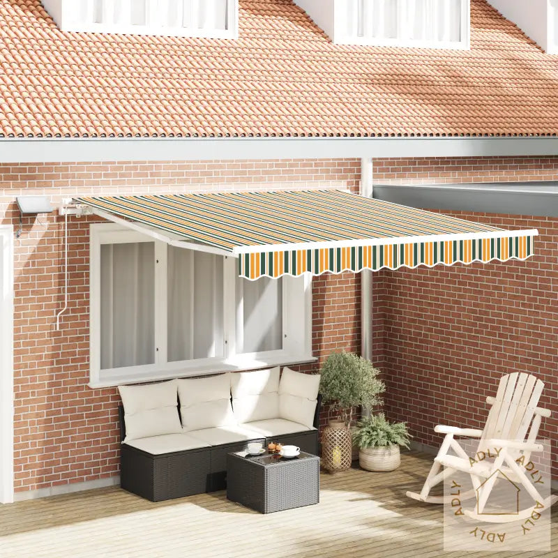 Denne uttrekkbare markisen gir effektiv UV-beskyttelse, så du og hagemøblene dine er skjermet mot sterke solstråler. Materialet i polyester er både vannbestandig og fargebestandig, så markisen holder seg pen og funksjonell over tid. Den har et moderne stripete design i grønne og gule toner, som gir uteområdet ditt et friskt og innbydende preg. Markisen er lett å operere manuelt og passer utmerket for alle som vil ha en fleksibel løsning uten komplisert elektrisk installasjon. Du får med alt nødvendig monteringsutstyr, og vi anbefaler at dere er to stykker for enkel og sikker montering.