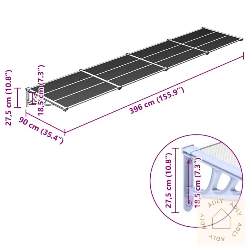Entrétaket bør ikke brukes hvor det kan ligge mye tung snø, da det ikke er laget for ekstreme snømengder.Farger: Grå og gjennomsiktig – gir et lett uttrykk og passer mange ulike stiler av hagemøbler og møbler til hjemmet.Materialer: PC (polykarbonat) for platene, ABS-plast for brakettene og slitesterk aluminium for stenger og kontakter.Samlet mål: 396 x 90 x 27,5 cm (L x B x H) – dekker god plass ved inngangspartier.Mål brakett (hver): 90 x 28 x 6 cm (L x B x T)Mål PC-plate (hver): 95 x 27,5 x 0,5 cm (L x B x T)Leveransen inneholder:12 x delte PC-brett5 x ABS-braketter8 x H-formede kontakter i oksidert aluminium8 x oksidert aluminiumsstangMed dette skjermtaket får du ikke bare beskyttelse mot dårlig vær, men også ekstra verdi gjennom enkel installasjon og kvalitetsmaterialer som matcher både klassiske og moderne utendørsmiljøer.