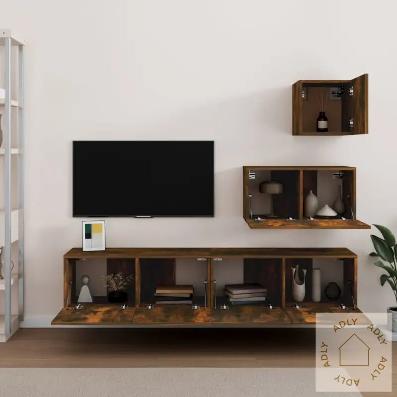 Slitesterkt materiale: Det konstruerte treverket har høy kvalitet, føles glatt og gir stabilitet samt motstandskraft mot fukt. Dette sikrer at TV-benken holder seg pen og solid over tid.Rikelig med lagringsplass: Du får masse plass til å organisere alt av multimedieutstyr, bokhyller og stående hyller, DVD-spillere, film, bøker og småting. Praktisk for å holde området rundt midtre tv-benk ryddig og oversiktlig.Veggmontert design: Benkene kan enkelt monteres på veggen, noe som gir ekstra oppbevaring og frigjør gulvplass. Smart hvis du vil ha hjemmet mest mulig åpent og ryddig.Merk:
