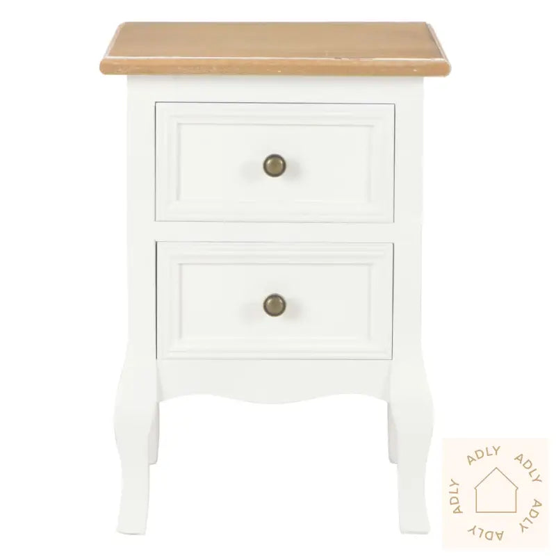 Farger: hvit + trefargeMaterialer: MDF, heltre furu og poppeltreMål: 35 x 30 x 49 cm (B x D x H)Med 2 skuffer for effektiv oppbevaringMontering kreves: jaLeveringen inkluderer 2 nattbord