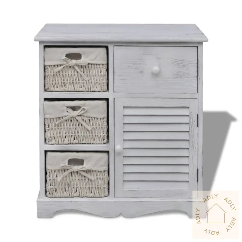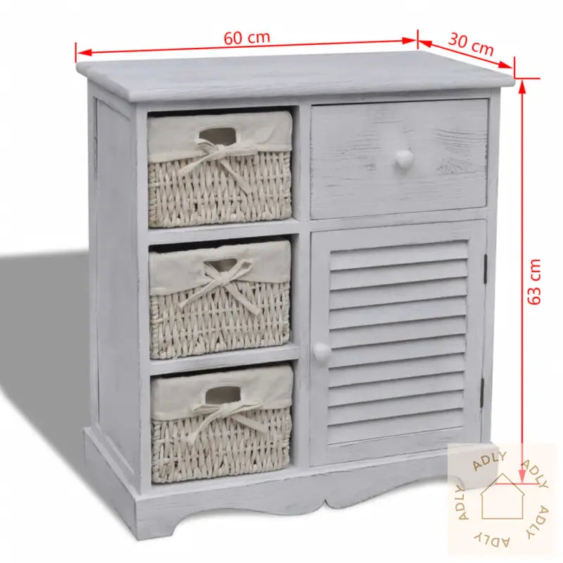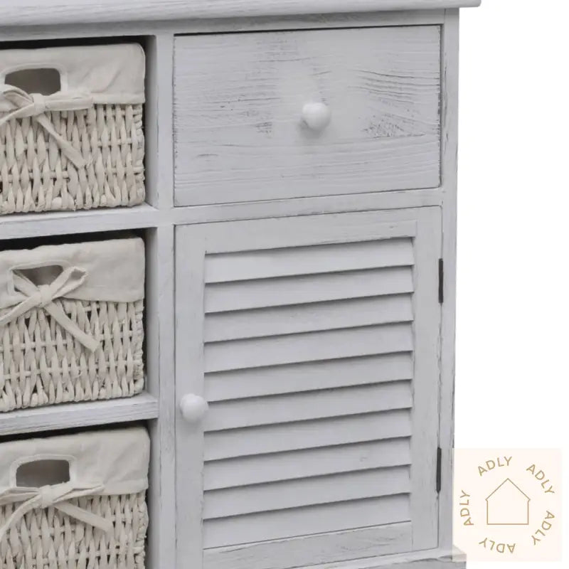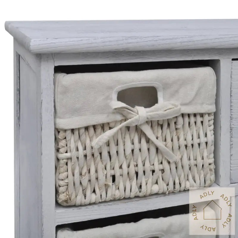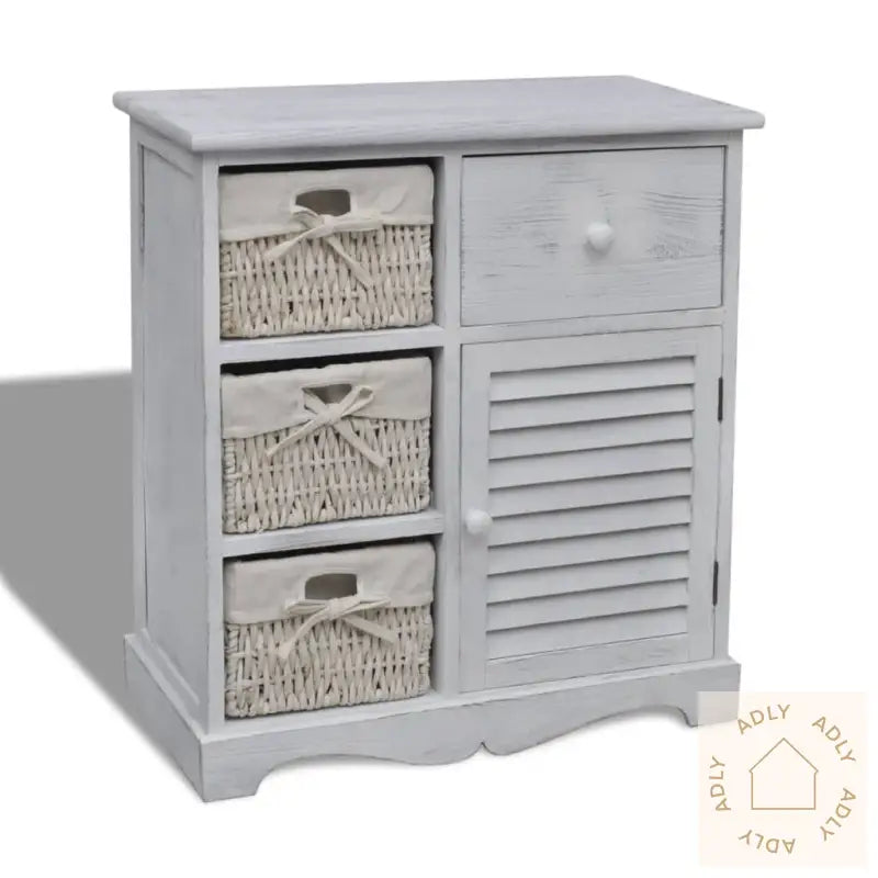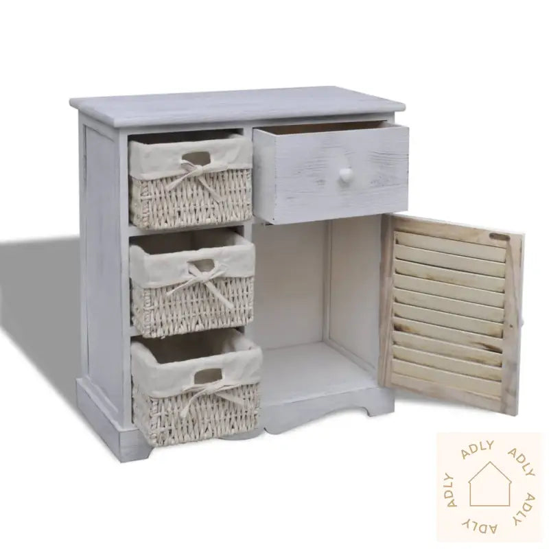 Det solide skapet gir rikelig med plass til oppbevaring av verdisaker, klær eller småting, og leveres komplett med tre vevde kurver som gjør det ekstra enkelt å holde orden. Det hvite skapet med naturlige kurver gir et rustikt og landlig preg, samtidig som det blender inn med både klassisk og moderne interiørstil. Treskapet vårt er den perfekte lagringsløsningen når du ønsker praktiske og stilrene møbler til hjemmet, og blir raskt en stor favoritt – uansett hvor du plasserer det.