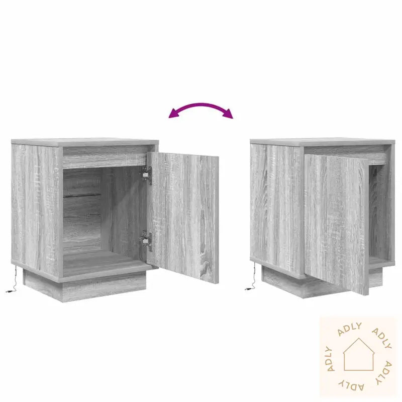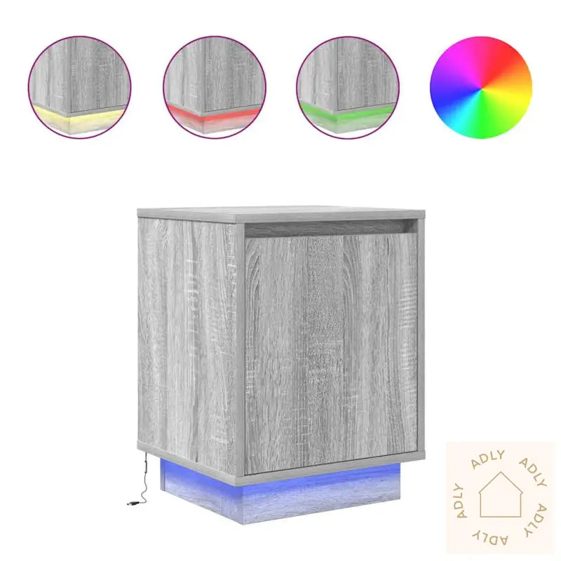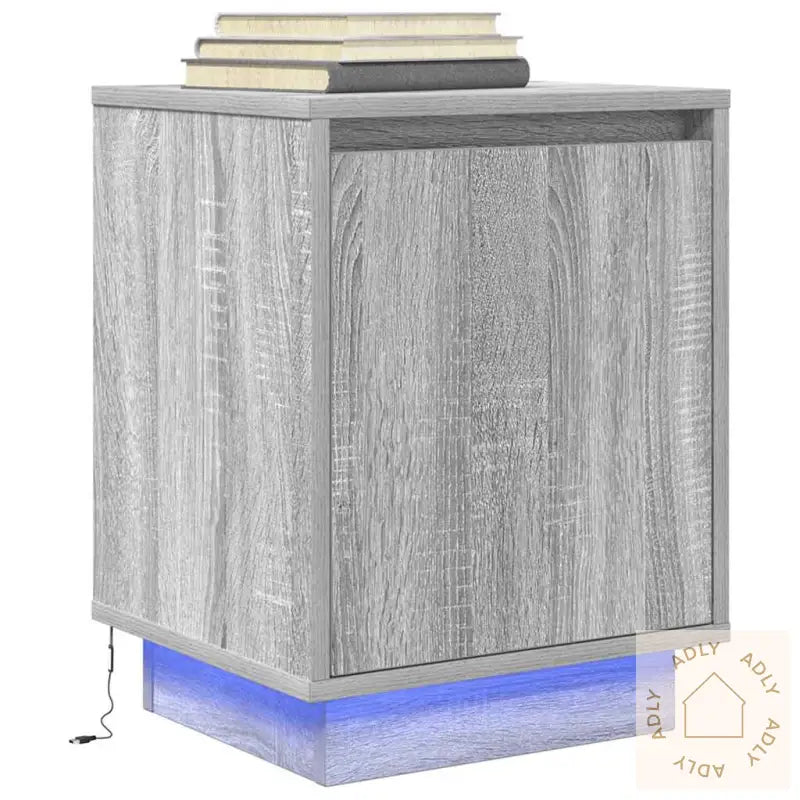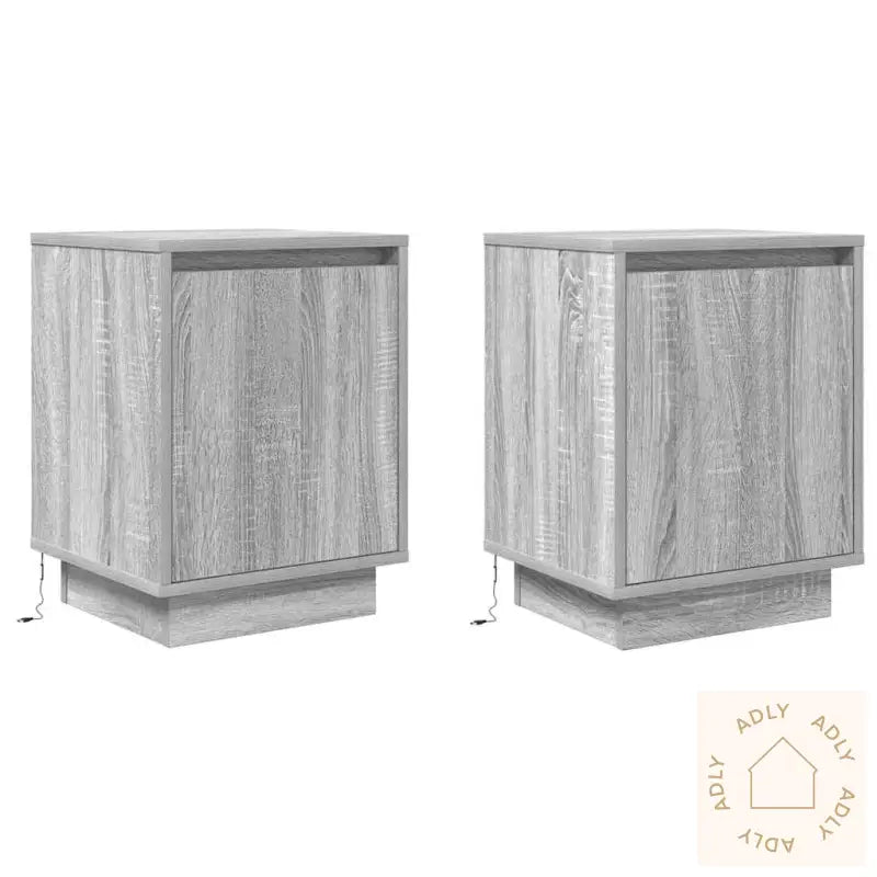Nattbordene har USB-kontakt og krever en sertifisert 5V USB-strømkilde for LED-lysene (strømkilden følger ikke med).Farge: Grå SonomaMateriale: Konstruert treMål (hver): 38 x 34 x 50 cm (B x D x H)Total vektkapasitet (stk): 60 kgMontering kreves: jaLeveransen inneholder:2 x nattbord