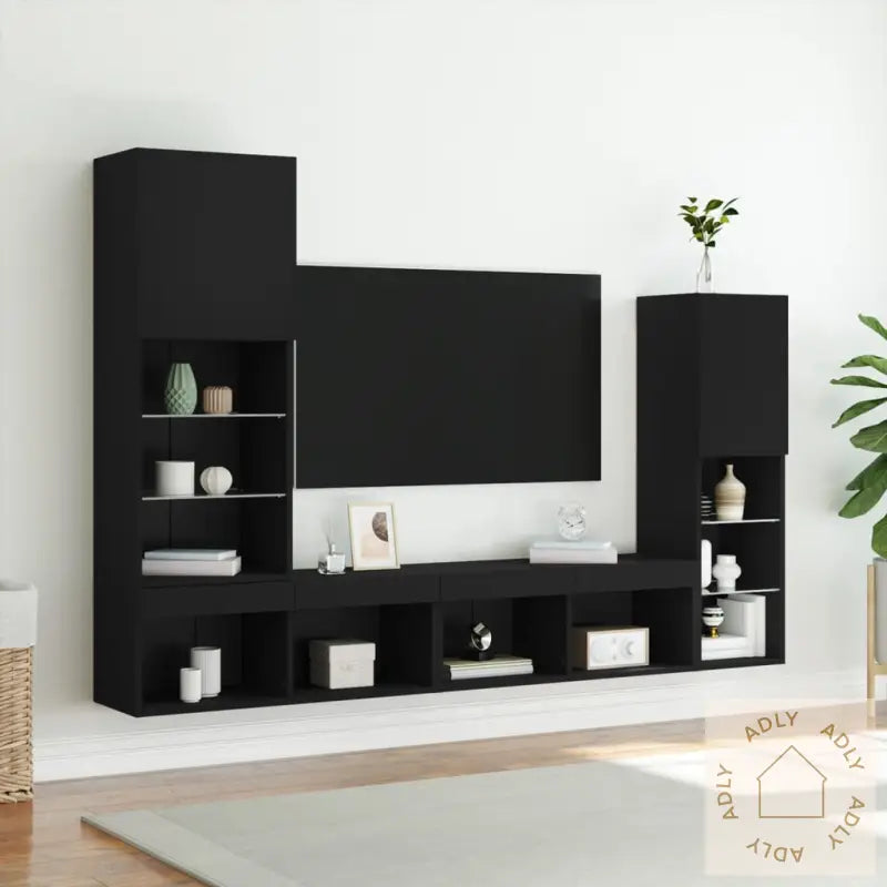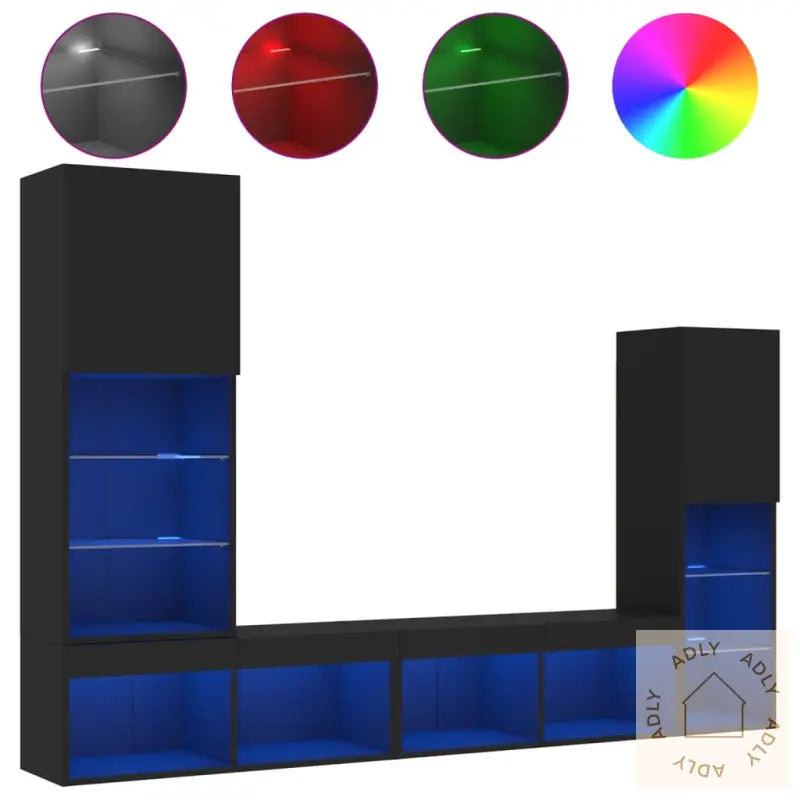 Solid materiale: Det konstruerte treverket har høy kvalitet, er slitesterkt og har en glatt overflate. Dette gjør at møblene blir stabile og tåler daglig bruk, i tillegg til å være motstandsdyktig mot fuktighet – noe som øker levetiden.RGB LED-lys: TV-enhetene leveres med innebygde RGB LED-lys som lyser i ulike farger. Du kan enkelt styre lysfargen via tilpassbare menyer, eller la lyset skifte automatisk for å matche stemningen i rommet. Med RGB led-lys får veggskapene et ekstra moderne og trendy preg, og du kan skape en unik atmosfære i stua, på soverommet eller arbeidsrommet.Veggmontert design: Siden enhetene monteres rett på veggen, frigjør du gulvplass og får samtidig lagt til ekstra lagringsmuligheter. Dette hjelper deg å holde rommet ryddig og gir et minimalistisk uttrykk som passer perfekt sammen med andre møbler.Rikelig med lagringsplass: Hvert veggskap gir god plass til bøker, DVDer, magasiner, medieutstyr og andre ting du ønsker å ha lett tilgjengelig. Her får du orden og oversikt – det gjør hverdagen mer praktisk og organisert.Allsidig design: Enten du bruker enheten som TV-benk hjemme eller som oppbevaringsløsning på kontoret, gir designet fleksibilitet. Veggskapene kan også brukes til å vise frem dekor eller forvandle en tom vegg til et spennende blikkfang sammen med andre møbler til hjemmet.Godt å vite: