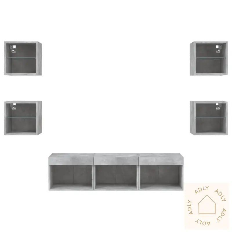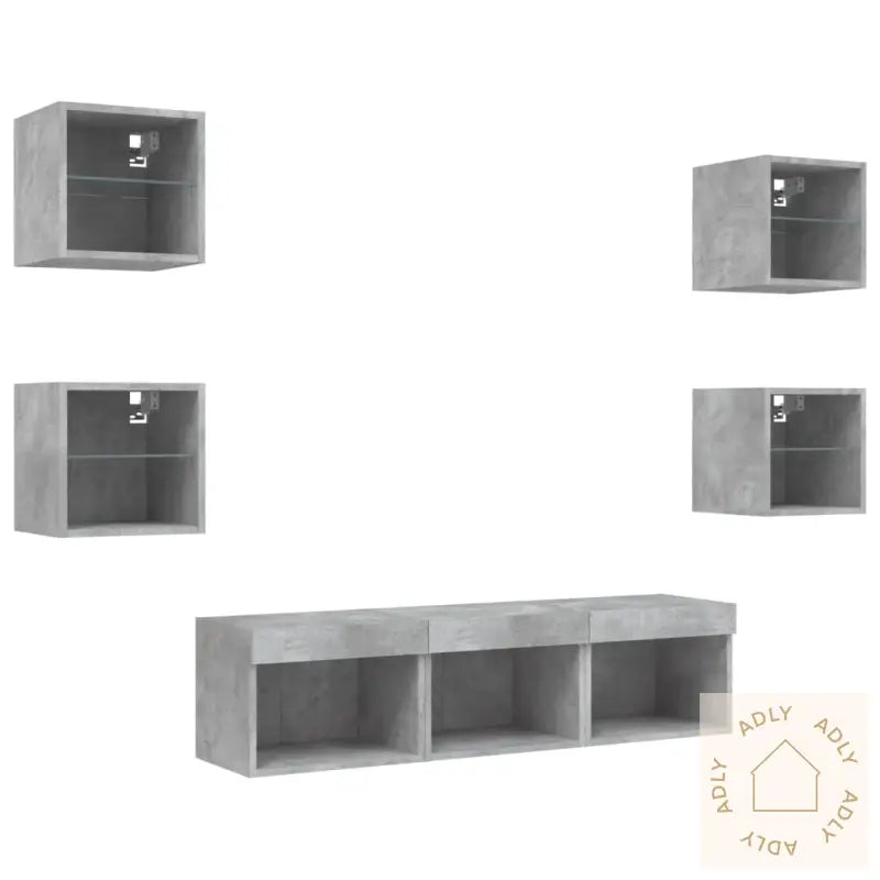Skruer og plugger til veggmontering følger ikke med. Velg passende festemidler til veggtypen du har – spør gjerne en fagperson hvis du er usikker. Husk å følge monteringsanvisningen nøye.Veggenheten leveres med USB-kontakt for RGB LED-lysene, så du trenger en sertifisert 5V USB-strømkilde (ikke inkludert).Farge: betonggråMaterialer: konstruert tre, glassMontering kreves: jaLeveransen inneholder:4 x veggskap: 30 x 28,5 x 30 cm (L x B x H)3 x veggskap: 40 x 30 x 30 cm (L x B x H)