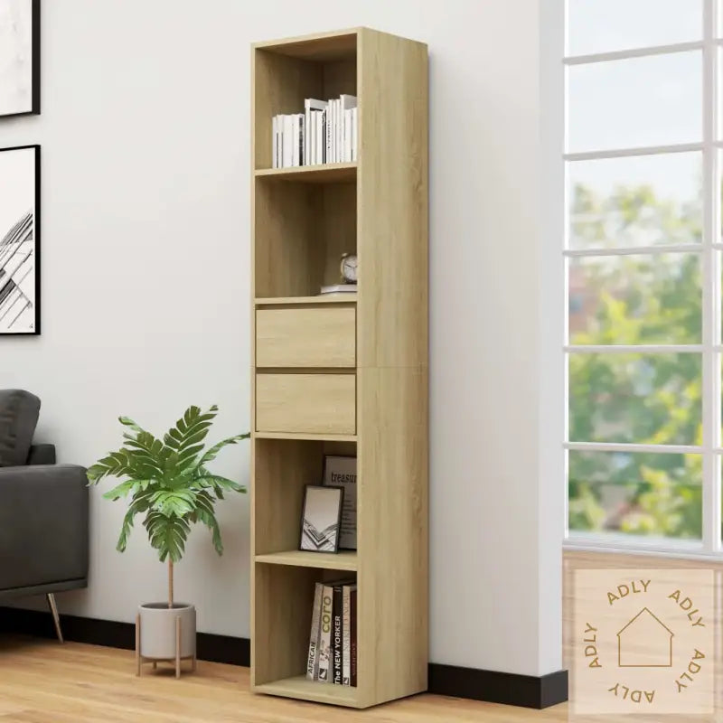 Denne bokhyllen er laget av konstruert tre som gir både styrke og solid holdbarhet over tid. Materialet gjør bokhyllen robust nok til daglig bruk, samtidig som det er enkelt å vedlikeholde. Bokhyllen har fire åpne hyller og to romslige skuffer, så du har god plass til å organisere alt fra bøker og magasiner til pynt, småting og dokumenter. Det gjør det lett å holde orden hjemme, og du har alltid favorittingene dine lett tilgjengelig. Med overflate i sonoma eik får møbelet et naturlig og lunt utseende som tilfører litt ekstra varme til interiøret ditt.