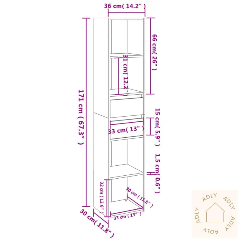 Farge: sonoma eikMateriale: konstruert treMål: 36 x 30 x 171 cm (B x D x H)Med 4 åpne hyller og 2 skufferMontering kreves: jaADVARSEL: For å forhindre at produktet velter, må medfølgende festemidler for vegg brukes.