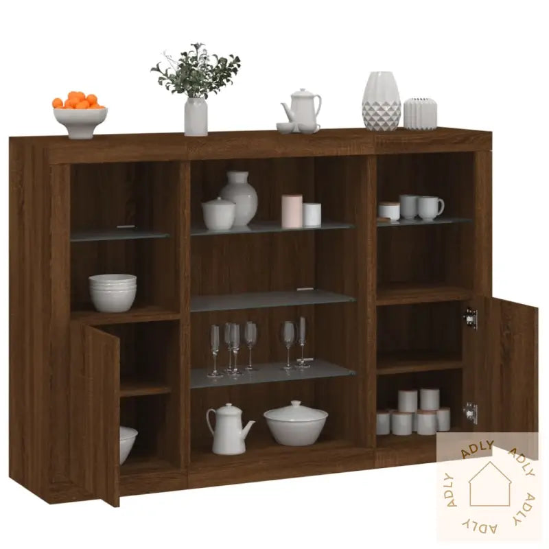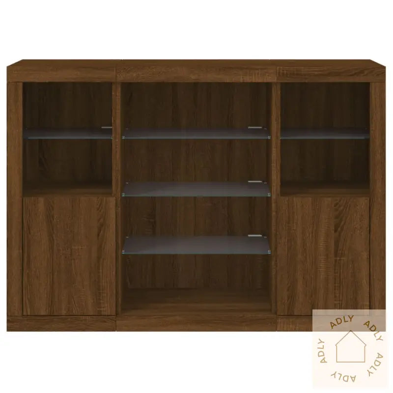 Denne modellen leveres med USB-kontakt, og du trenger en sertifisert 5V USB-strømkilde for å bruke LED-lysene (strømkilden følger ikke med).Farge: brun eikMaterialer: konstruert tre, glassSamlet mål: 142,5 x 37 x 100 cm (B x D x H)Montering kreves: jaLeveransen inneholder:2 x skjenker: 41 x 37 x 100 cm (B x D x H)1 x skjenk: 60,5 x 37 x 100 cm (B x D x H)Legal Documents:
