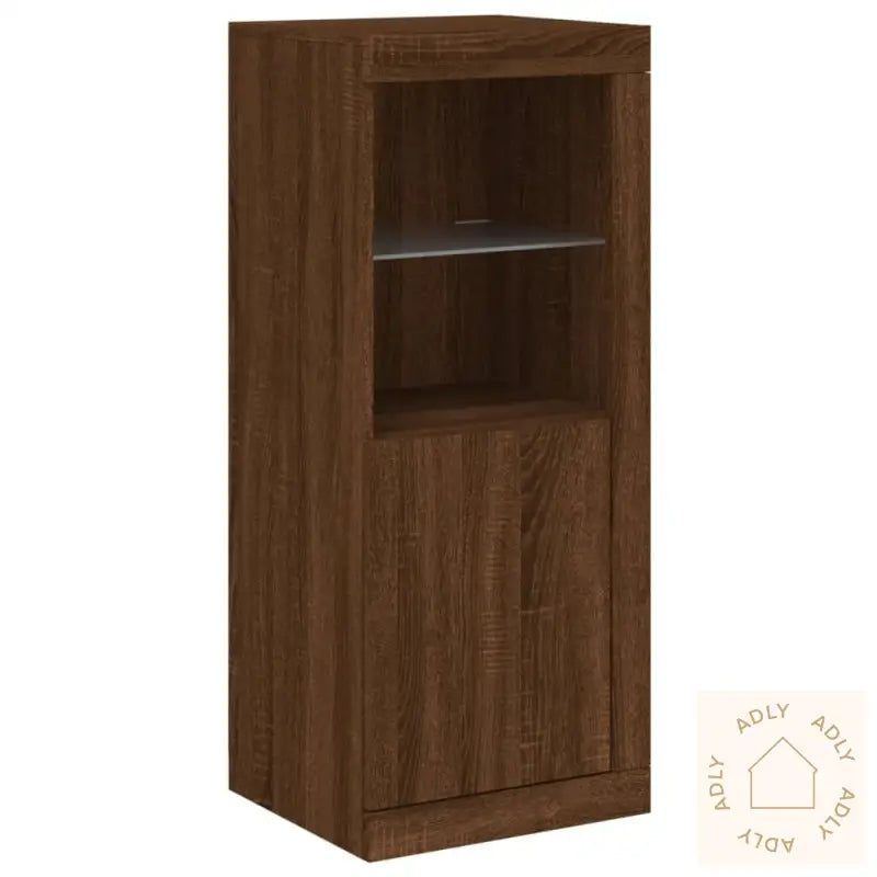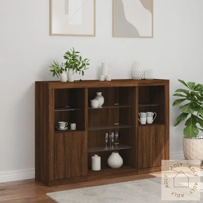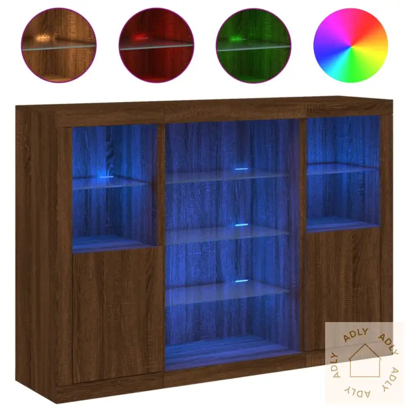 Gi rommet ditt et moderne preg med våre stilige skjenker i brun eik, designet for å passe naturlig inn sammen med møbler til hjemmet ditt uansett stil. Med innebygde RGB LED-lys kan du enkelt endre stemningen og matche belysningen til resten av interiøret – og det gjør skjenkene både funksjonelle og dekorative.