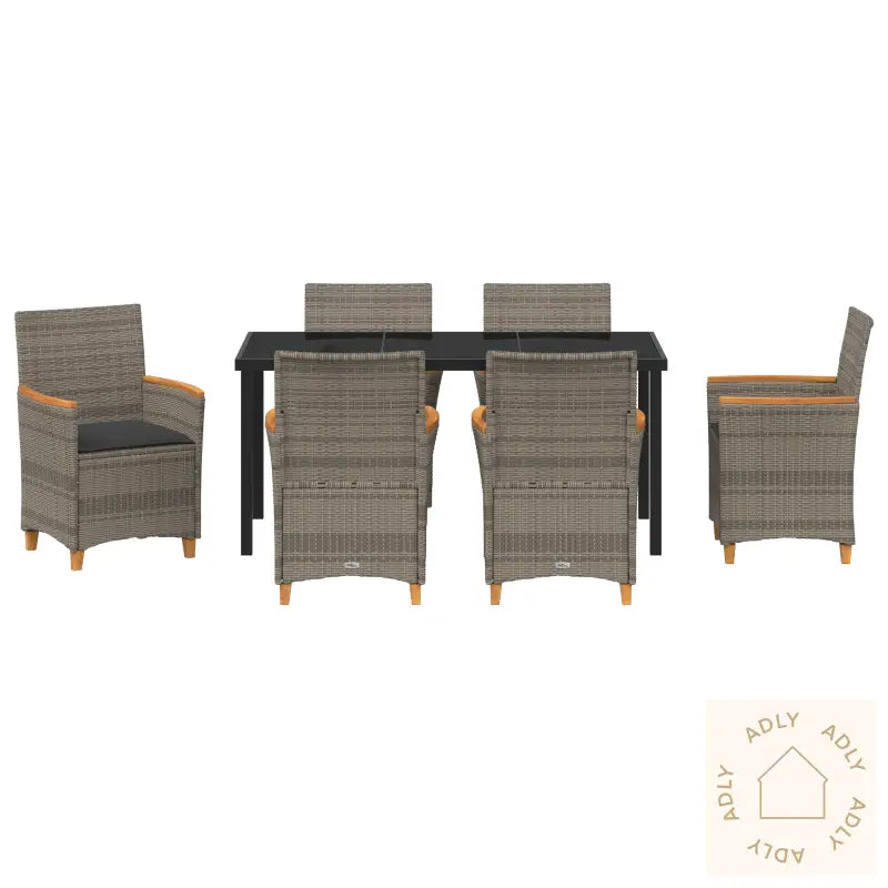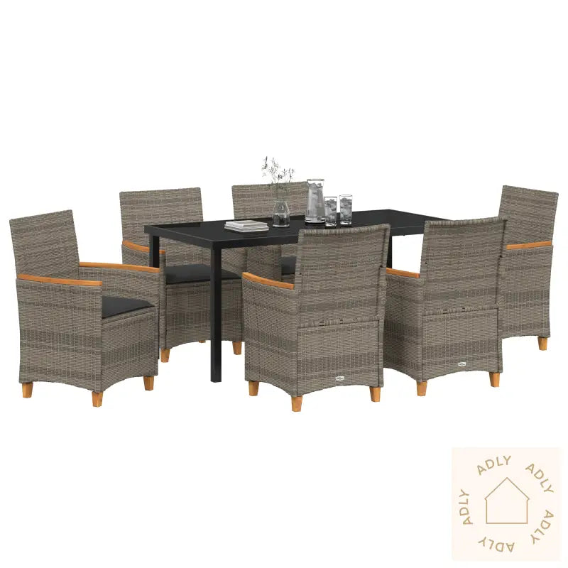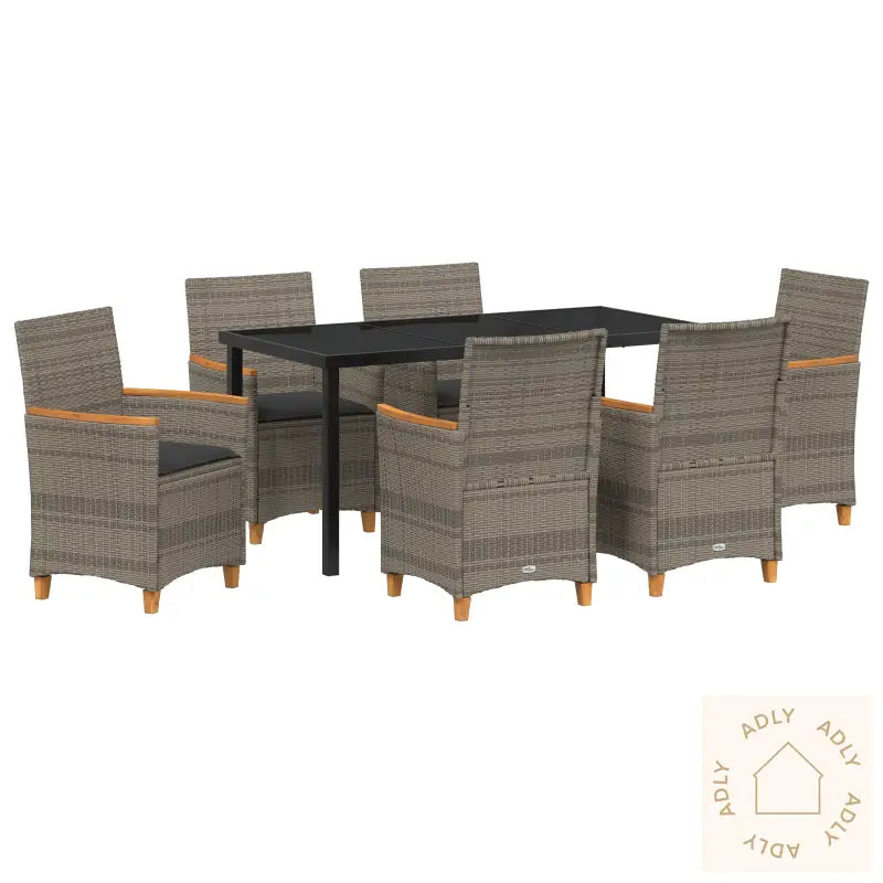 Holdbart materiale: Det syntetiske poly rotting-materialet ser ut som naturlig rotting, men er spesielt designet for å tåle norsk vær og være vedlikeholdsvennlig. Det gjør at møblene dine holder seg pene sesong etter sesong, og passer perfekt inn i moderne uterom.Komfortable sitteplasser: Hver stol leveres med tykke, myke puter som er avtagbare og vaskbare. Dette gir deg en ekstra luksuriøs følelse og praktisk bruk – du kan lene deg tilbake og virkelig nyte hagemøblene når du inviterer familie eller venner.Stabil ramme: Stolene er bygget på en pulverlakkert stålramme, som gir solid støtte og tåler belastning på opptil 110 kg per sete. Du får med andre ord stabile og trygge hagemøbler, som varer lenge.Enkel vedlikehold: Med avtakbare trekk på putene, er rengjøringen enkel og rask. Hold møblene dine rene og freshe gjennom hele sesongen uten noe stress — kun minimale vedlikeholdsrutiner kreves.Allsidig bruk: Det stilrene designet gjør disse møblene til hjemmet ditt veldig fleksible – de passer både til middag, avslapning med en bok, koselige samlinger, eller bare litt soling på terrassen. Funksjonalitet kombineres sømløst med moderne stil.Antall varer: 7Farge: GråForm: RektangulærMateriale: Syntetisk Poly RottingOverflate: OljetInnendørs/Utendørs: Kun utendørsTrekk inkludert: JaRom: Garten und TerrassegBatterier inkludert: NeiHodegjerde inkludert: NeiKapacitet: 110 kg per seteMaksimalt antall personer: 6Maksimal vekt: 110 kgOverflatehøyde: 19 cmBenhøyde: 45 cmSetedybde: 46 cmSittekapasitet: 6Gynger: NeiStige: NeiMerke: Levering inkluderer: 6 x Hage stol, 1 x Hage bordMå monteres: JaAnbefalt antall personer for montering: 2