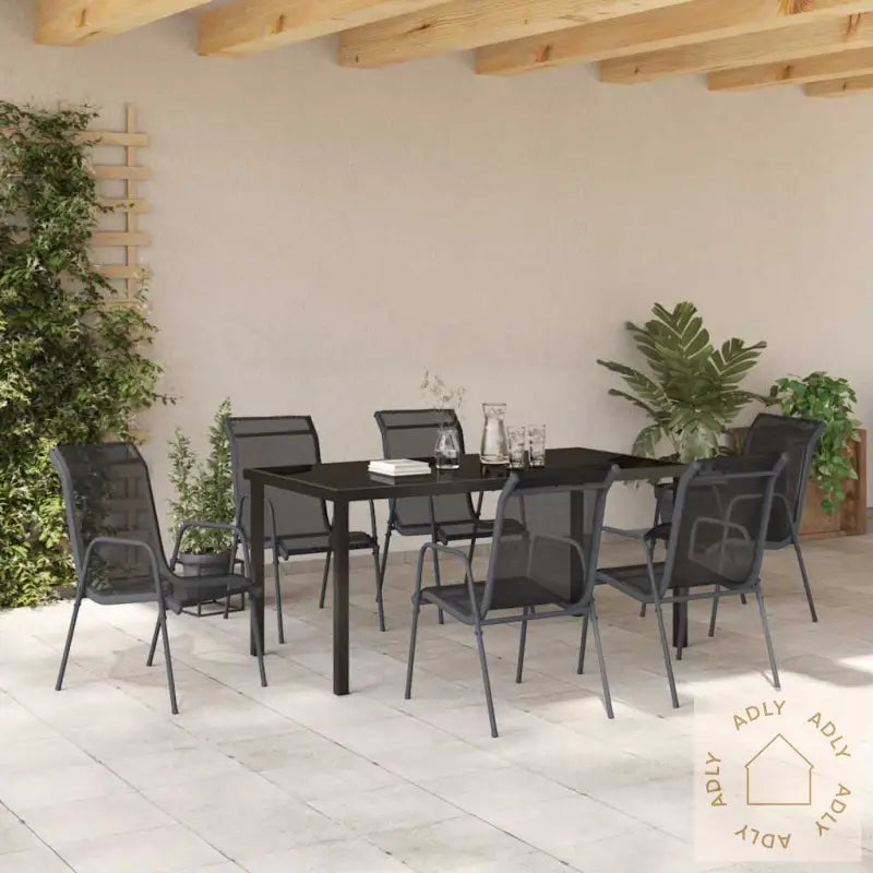 Settet inneholder et solid, rektangulært bord i svart pulverlakkert metallstål og seks komfortable, stabelbare stoler med matchende finish i svart og antrasitt. Den stramme fargepaletten gir et tidløst inntrykk og passer lett inn sammen med andre hagemøbler. Stolene kan stables for enkel oppbevaring, som gjør dette settet ekstra brukervennlig når plassen skal utnyttes maksimalt. Metallmaterialet er valgt for å tåle norske værforhold, så du får møbler til hjemmet og uteplassen som varer lenge.