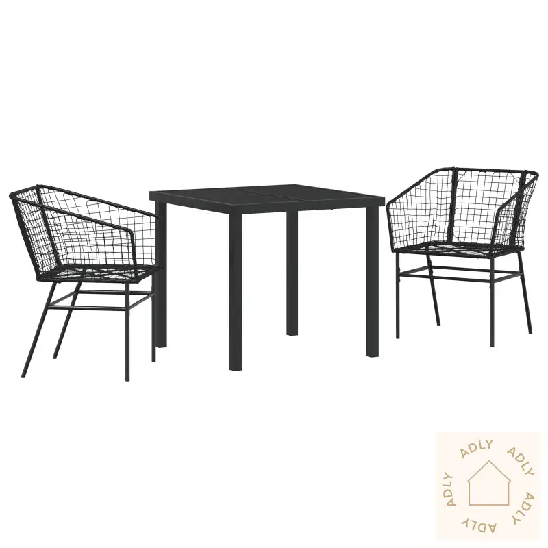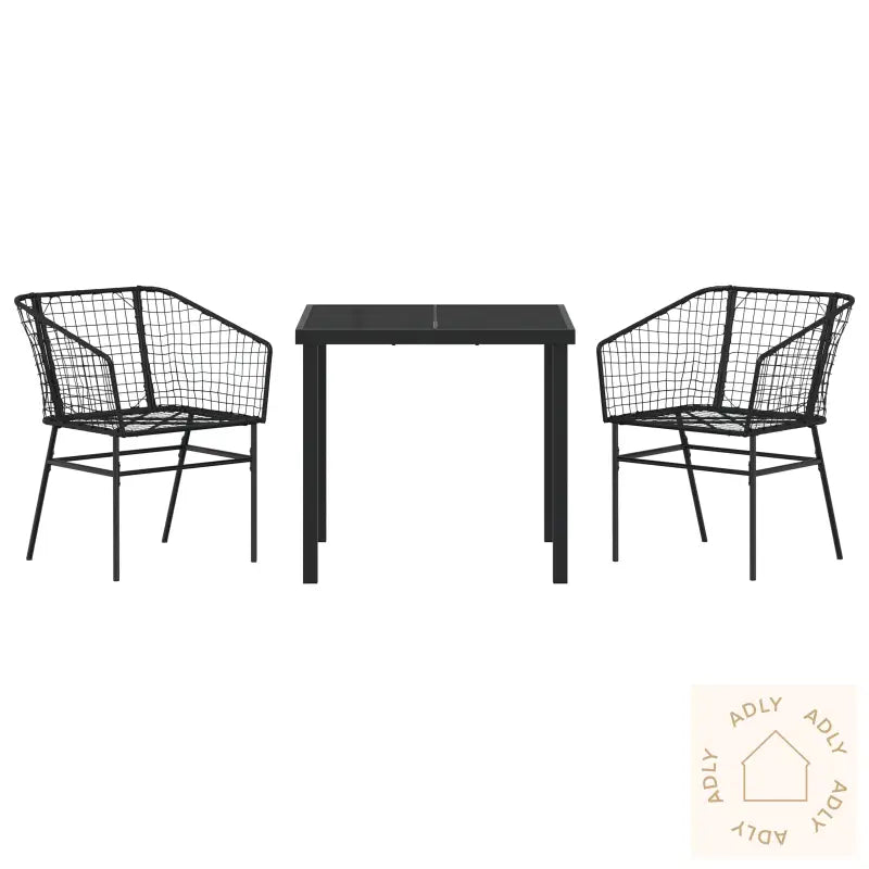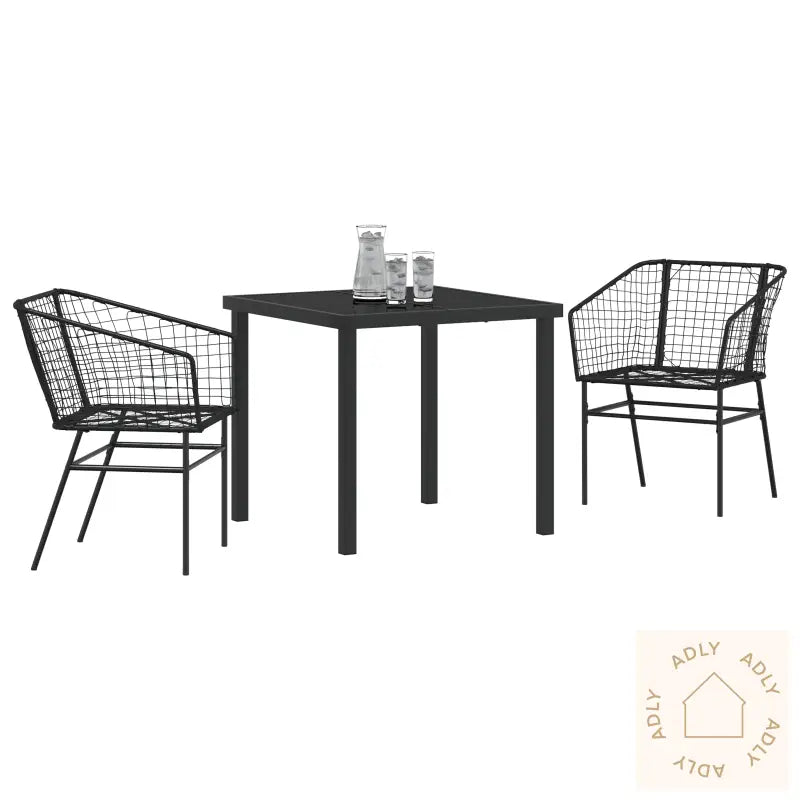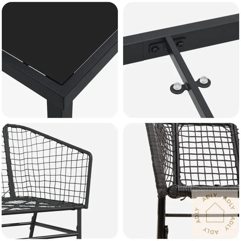 Antall enheter: 3Farge: SvartForm: AnnenMateriale: Syntetisk polyrottingOverflate: PulverlakkertInnendørs/Ute: Innendørs / UtendørsTrekk inkludert: NeiRom: Hagen og terrasseBatterier inkludert: NeiHodegjerde inkludert: NeiMaks antall personer: 2Maks vekt: 110 kgMontering inkludert: NeiBenhøyde: 45 cmSitte dybde: 48 cmSittekapasitet: 2Gyngestol: NeiStige: NeiMerke: Leveransen inneholder: 2 x hagemøbler, 1 x bordMontering nødvendig: JaAnbefalt antall personer for montering: 1