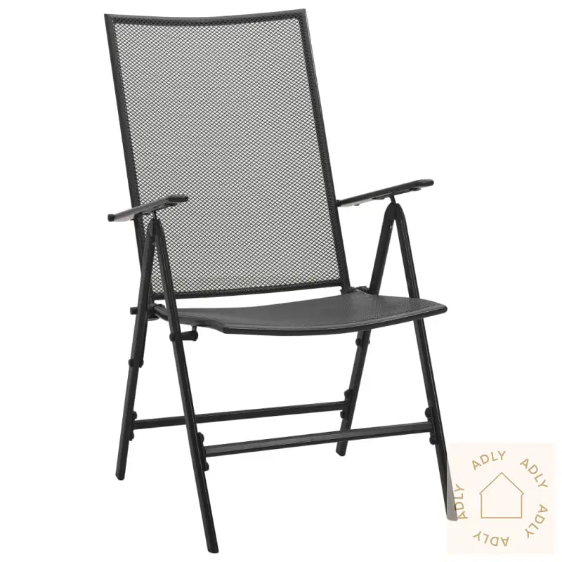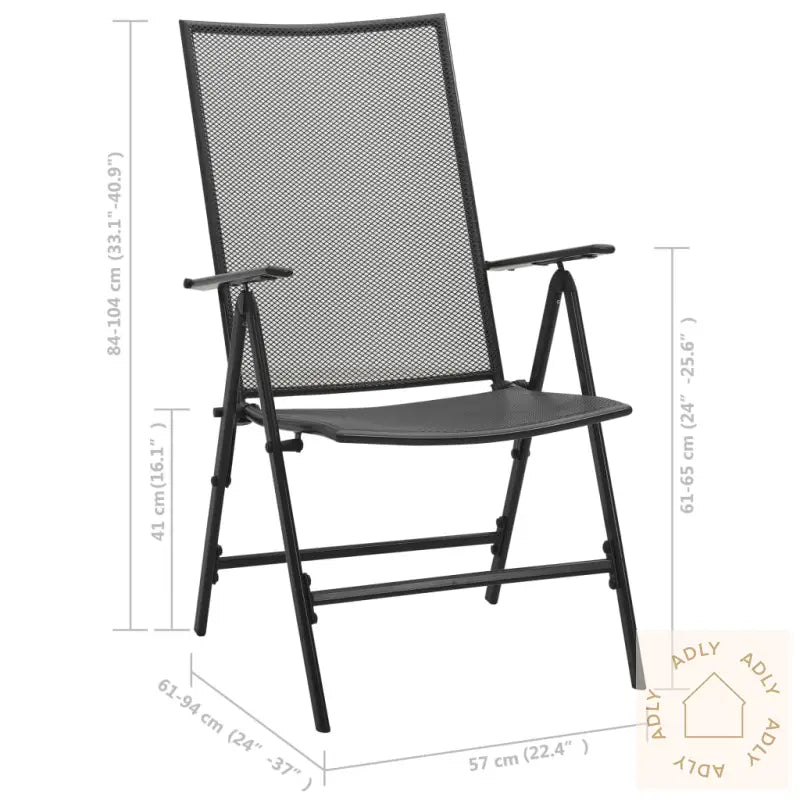 Farge: antrasittMaterialer: stål med pulverlakkMål (utfoldet): 57 x (61-94) x (84-104) cm (B x D x H)Mål (brettet): 86 x 57 x 14 cm (L x B x H)Mål sete: 46 x 40 cm (B x D)Høyde sete fra bakken: 41 cmHøyde armlene fra bakken: 61 - 65 cmElegant nettingdesign og robust konstruksjonRust- og værbestandig for lang ytelse sommer etter sommerJusterbar ryggstøtte i 6 stillinger for optimal komfortKan brukes både innendørs og utendørs – funksjonelle og allsidige hagemøblerSammenleggbar: ja – enkel å lagre og flytte rundtMaksimal lastekapasitet (per sete): 110 kgLeveransen inneholder:4 x sammenleggbare stoler