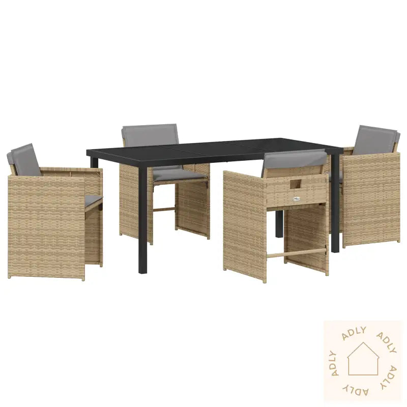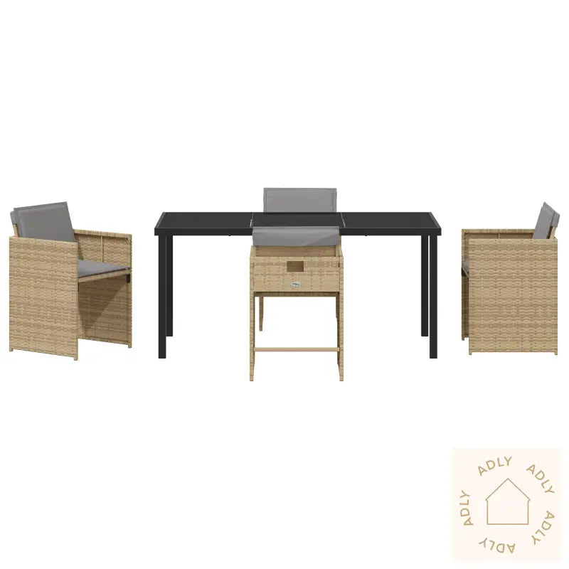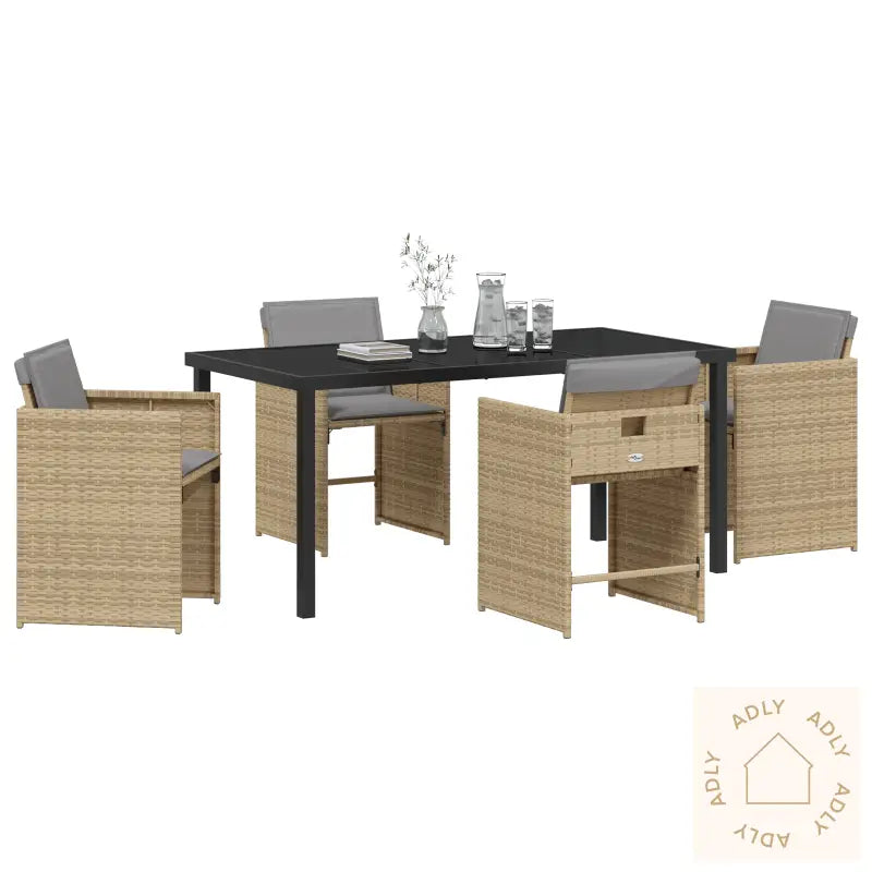Dette stolesettet for terrassen kombinerer moderne stil med praktiske funksjoner – et perfekt valg for deg som elsker å nyte måltider eller avslapping utendørs. Her får du robuste hagemøbler laget av holdbar PE-råtten i trendy beige, med myke, lysegrå puter som gir ekstra komfort. Settet gir en koselig og stilig sitteplass som gjør både familiesamlinger og hyggelige kvelder ute enda bedre.