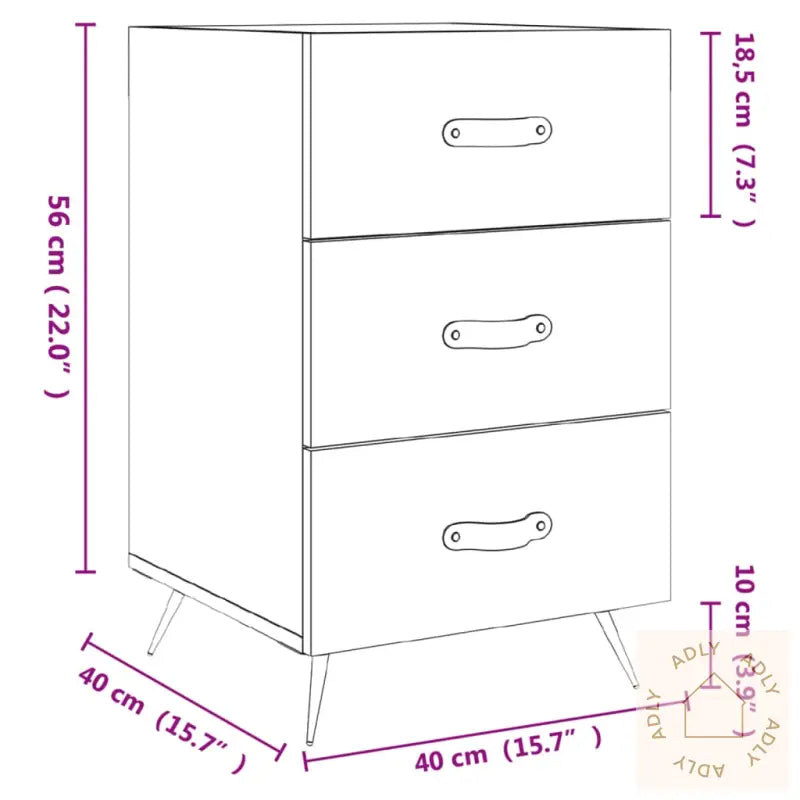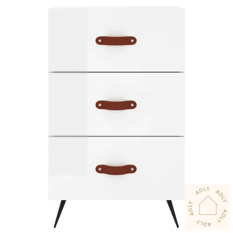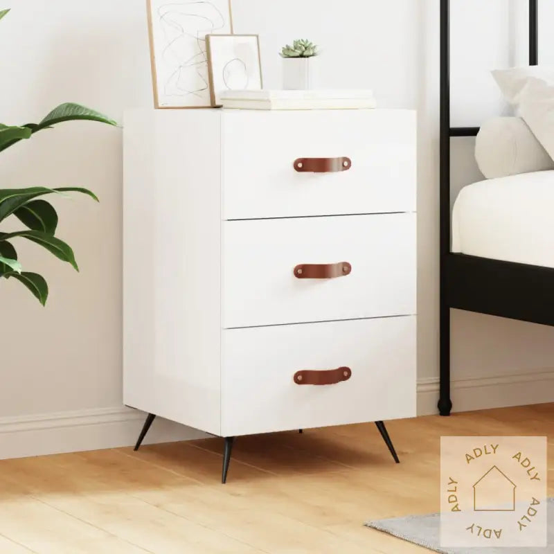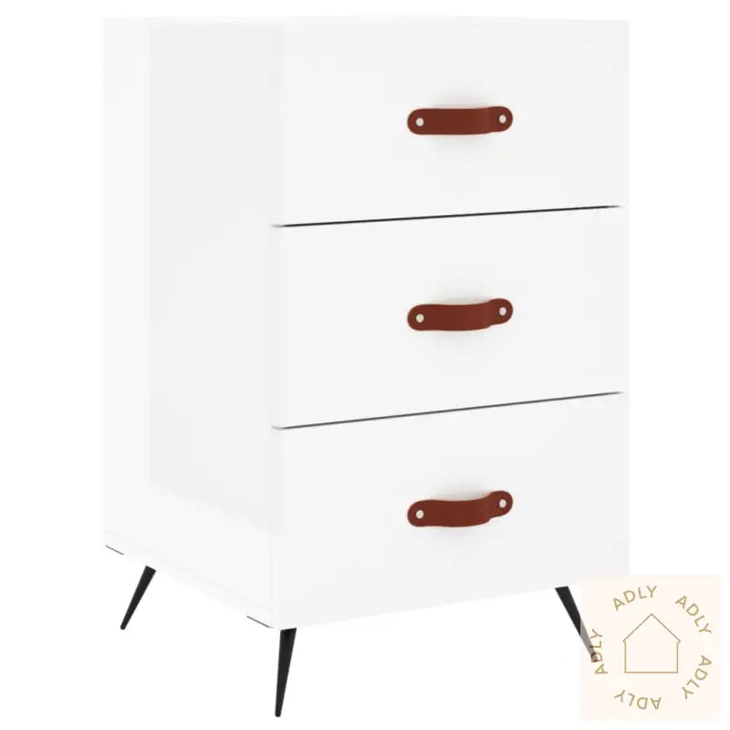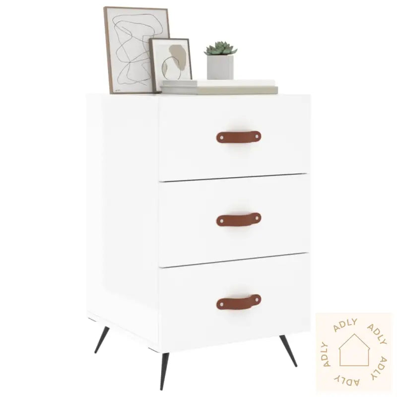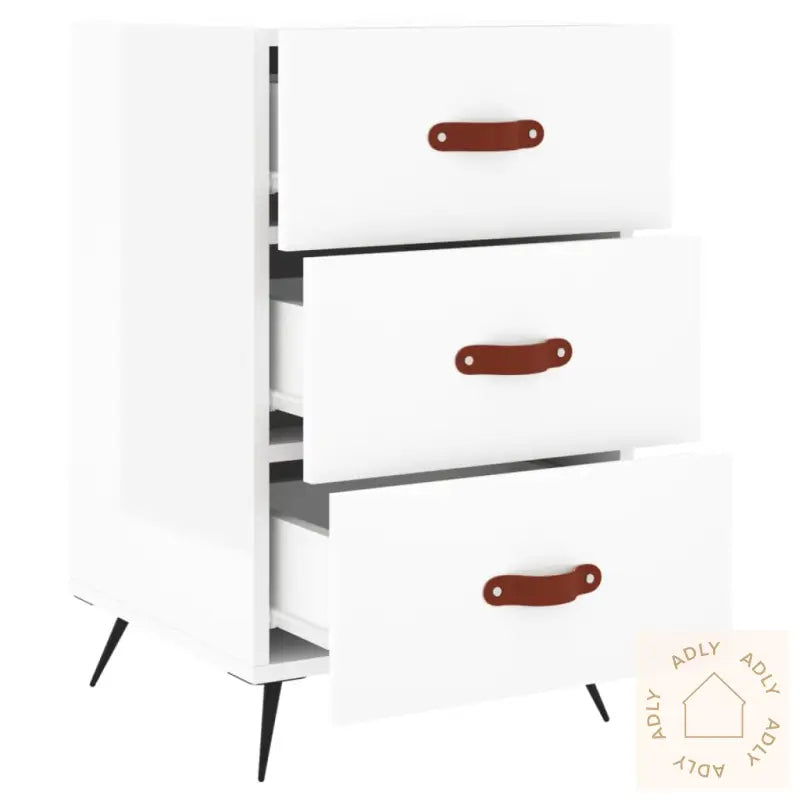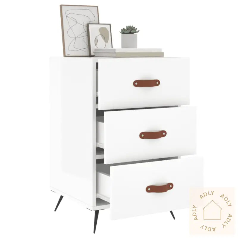 Slitesterkt materiale: Nattbordet er laget av konstruert tre, noe som gir en jevn og robust overflate, styrker stabiliteten og sikrer lang levetid selv ved daglig bruk. Materialet motstår fuktighet, så du slipper å bekymre deg for vannsøl fra blomster eller drikke.Romslig oppbevaring: Med romslige skuffer får du rikelig plass til alt du liker å ha lett tilgjengelig ved sengen. Enten det er favorittbøkene dine, multitmediautstyr eller småting du bruker hver dag, holder dette nattbordet alt organisert og innen rekkevidde. Det gir en ryddig følelse på soverommet, og gjør det enklere å slappe av.Visningsfunksjon: Bordplaten gir deg mulighet til å vise frem dine beste dekorasjoner – fra personlige bilder til vakre planter eller stilrene pynteting. Den glansfulle, hvite flaten gjør at elementene dine virkelig kommer til sin rett og bidrar til å løfte atmosfæren i rommet sammen med dine andre møbler og bokhyller.Metallføtter: De solide metallføttene gir en stilig kontrast og tilfører nattbordet et moderne preg. Samtidig sørger de for god stabilitet, noe som er spesielt praktisk dersom du setter tunge gjenstander på toppen - eller har aktive barn og kjæledyr hjemme.Advarsel: