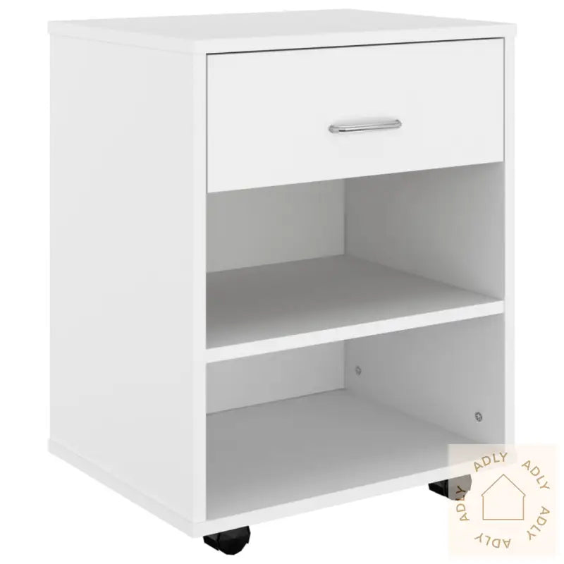 Farge: hvitMateriale: konstruert treMål: 46 x 36 x 59 cm (B x D x H)Enkel å rulle med 4 hjul (2 av dem låsbare)Montering kreves: ja