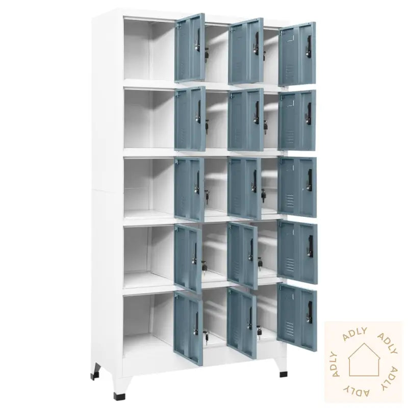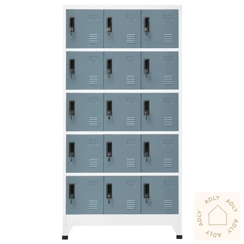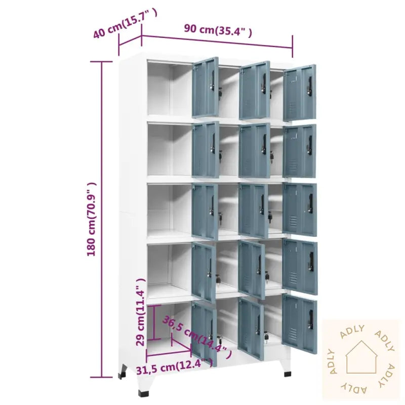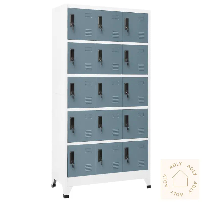 Farger: lysegrå og mørkegråMateriale: stålMål: 90 x 40 x 180 cm (B x D x H)15 låsbare dører (2 nøkler inkludert for hver dør)Med luftventiler og navnelappholdere på dørerLastekapasitet per rom: 10 kgTotal lastekapasitet: 150 kgMontering kreves: jaADVARSEL: For å forhindre at produktet velter må de medfølgende festene for vegg brukes