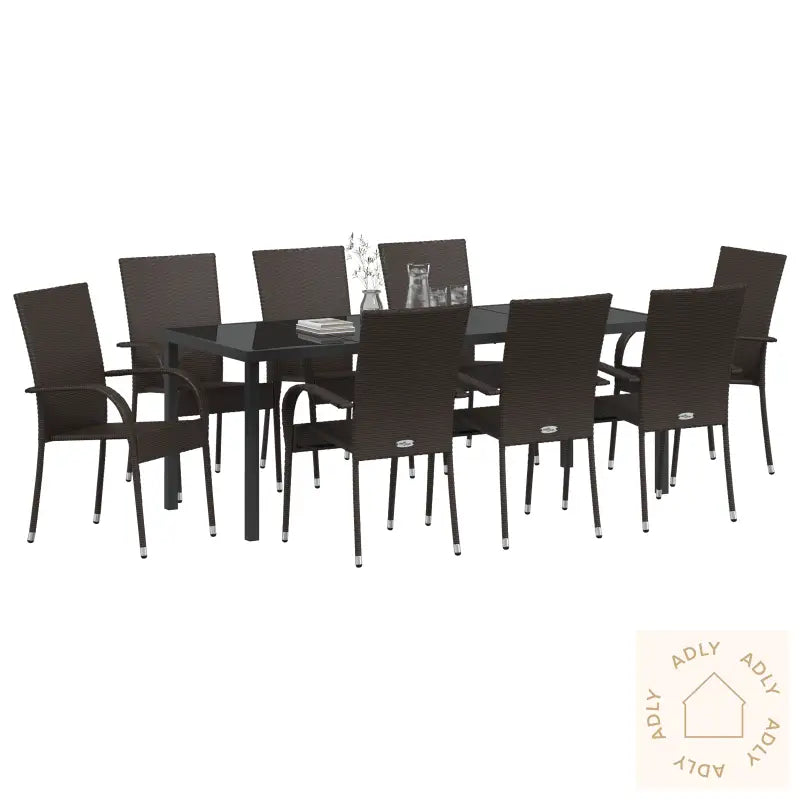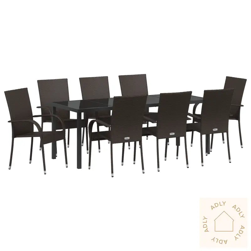 Robust Konstruksjon: Den solide pulverlakkerte stålrammen sørger for stabilitet og pålitelighet, enten det er middag eller sosialt samvær i hagen.Værbestandig: Stolene er laget av PE rattan, et syntetisk materiale kjent for å være vannavvisende og enkelt å rengjøre. Dermed kan du la møblene stå ute i all slags vær uten å bekymre deg – perfekt for deg som ønsker praktiske og holdbare møbler til hjemmet ditt.Plassbesparende Design: De stabelbare stolene gjør det enkelt å rydde bort møblene når de ikke er i bruk. Det gir deg mer plass på terrassen, balkongen eller i hagen når du trenger det mest.Komfortabel Sitteplass: Ergonomisk utformede stoler gir støtte i ryggen, slik at både måltider og lange kvelder ute blir ekstra behagelig.Moderne Stil: Rene linjer og elegante farger gjør at denne spisegruppen passer inn i ethvert uterom. Enten det er terrasse, balkong eller hage, gir denne gruppen en oppgradering til dine utendørsmøbler.Antall Artikler: 9Farge: BrunForm: RektangulærMateriale: Syntetisk Poly RattanOverflate: PulverlakkertInnendørs/Utendørs: Kun utendørsBeskyttelse inkludert: NeiBatterier inkludert: NeiSenget ramme inkludert: NeiKapacitet: 4 personerMaksimalt antall personer: 8Benhøyde: 44.00 cmSittedybde: 43.00 cmSittekapasitet: 8Gynging: NeiStige: NeiMerke: Leveransen Inneholder: 1 x Bord, 8 x StolerMontering kreves: JaAnbefalt antall personer for montering: 2