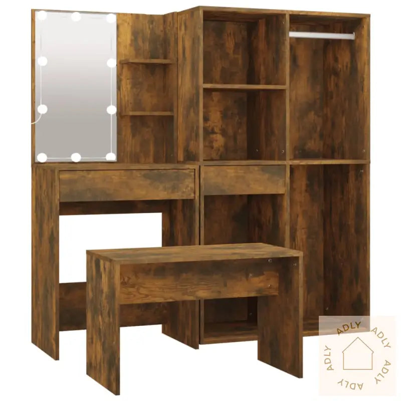 Farge: røkt eikMaterialer: konstruert tre, akrylMål sminkebord: 60 x 40 x 140 cm (B x D x H)Mål krakk: 70 x 35 x 45 cm (L x B x H)Mål øvre skap: 80 x 40 x 65 cm (B x D x H)Mål nedre skap: 80 x 40 x 75 cm (B x D x H)Leveransen inneholder:1 x sminkebord1 x krakk1 x overskap1 x underskapLegal Documents: