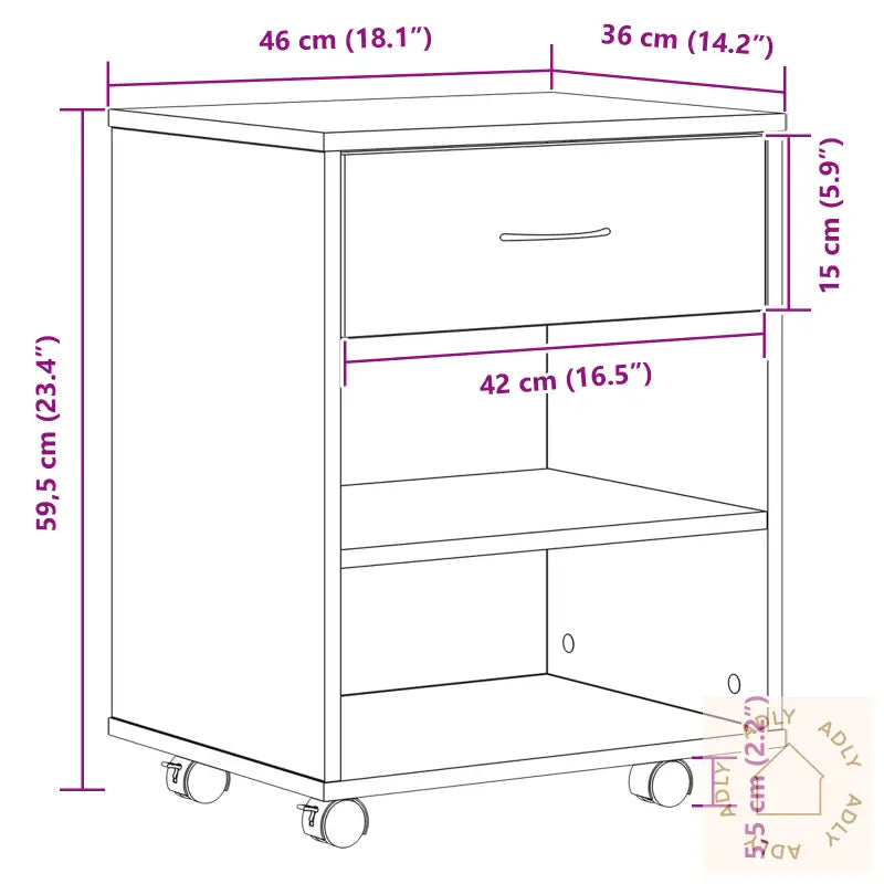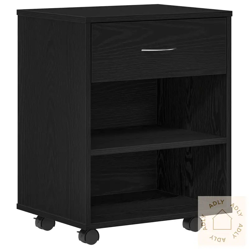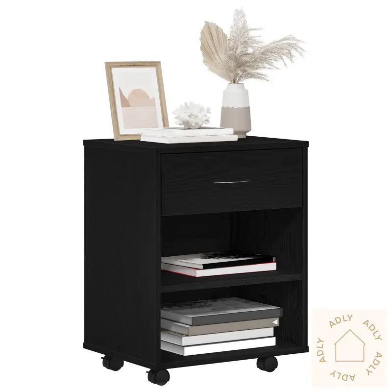 Rikelig lagringsplass: Skapet har tre adskilte rom slik at du enkelt kan sortere alt fra viktige kontorrekvisita til hobbyutstyr og verktøy. Dette gir deg oversikt, orden og alt lett tilgjengelig – spesielt smart hvis du ønsker allsidige møbler til hjemmet.Rullbar design: Fire solide hjul gjør skapet enkelt å flytte mellom ulike rom, noe som gir stor fleksibilitet i hverdagen. Perfekt for deg som liker å endre på møbleringen eller har behov for mobile lagringsløsninger.Stilig finish: Den matte svarte eikefinishen skaper et sofistikert uttrykk som harmonerer med både tradisjonelle og moderne interiørstiler. Dette oppbevaringsmøbelet løfter utseendet i rommet på en diskret, elegant måte.Holdbar bygg: Skapet er laget av robust konstruert treverk og er bygget for å tåle daglig bruk. Overflaten holder seg pen over tid, slik at du kan være trygg på å investere i holdbare møbler med lang levetid.Allsidig bruk: Passer like godt som hjemmekontorskuff, i stua for oppbevaring av småting, eller på verkstedet for å holde verktøyene organisert. Perfekt både for deg som vil ha orden i sakene og for deg som ønsker møbler som kan brukes i flere rom.Farge: Svart Form: RektangulærMateriale: Konstruert treFinish: MattInnendørs/Utvendig: Kun innendørsDeksel inkludert: NeiRom: KontorOverflatehøyde: 2 cmHjuldiameter: 4 cmStige: NeiMerke: Montering kreves: JaAnbefalt antall personer for montering: 1