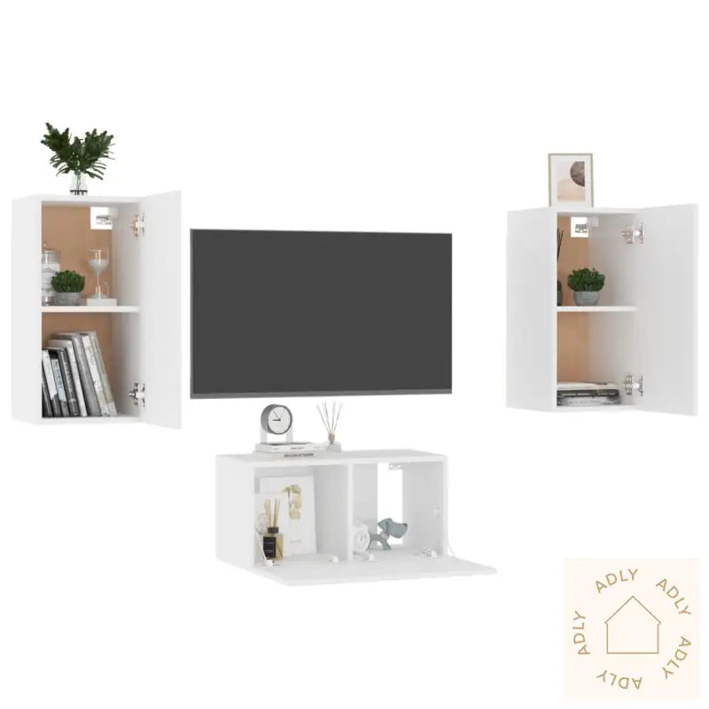 Farge: hvitMateriale: konstruert treMål (stort): 60 x 30 x 30 cm (B x D x H)Mål (M): 30,5 x 30 x 60 cm (B x D x H)Montering kreves: jaLeveransen inneholder:1 x TV-benk (L)2 x TV-benker (M)