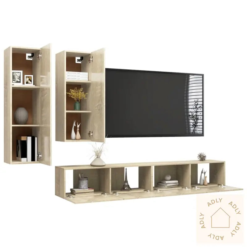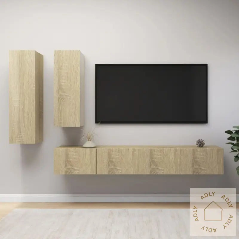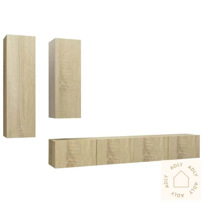 Farge: sonoma eikMateriale: konstruert treMontering kreves: jaLeveransen inneholder:1 x TV-benk: 30,5 x 30 x 110 cm (B x D x H)1 x TV-benk: 30,5 x 30 x 90 cm (B x D x H)2 x TV-skap: 100 x 30 x 30 cm (B x D x H)