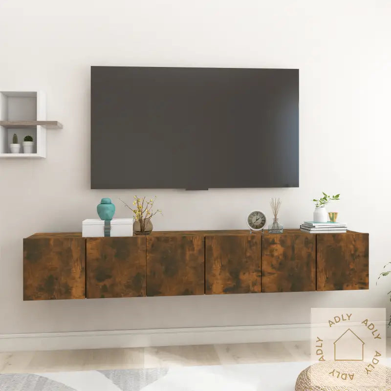 Premium materiale: Produsert i konstruert treverk av høy kvalitet, kjent for sin jevne overflate, styrke og stabilitet. Materialet motstår fuktighet, noe som gjør det ekstra holdbart – ideelt for deg som vil ha solide møbler som varer lenge.Rikelig med lagringsplass: Hver TV-benk har to rom hvor du enkelt kan organisere fjernkontroller, magasiner, filmer eller andre småting. Dette gir en ryddigere og mer oversiktlig stue, samtidig som det er lettere å holde orden på favorittgjenstandene dine.Moderne stil: Vegghengte TV-benker med minimalistisk design gjør at de matcher lett med ulike typer møbler og innredningsstiler, enten du kombinerer dem med populære hagemøbler eller bokhyller og stående hyller. Med sitt rene uttrykk bidrar de til et luftig og organisert uttrykk hjemme.Merk: