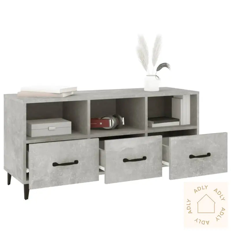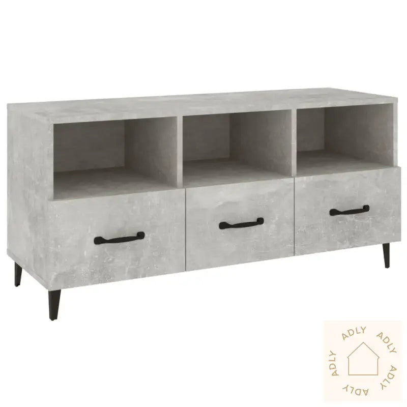 Hvert produkt leveres med en tydelig monteringsveiledning i esken som gjør det enkelt å sette sammen møblene.Farge: Betonggrå – passer perfekt sammen med både moderne og klassiske interiørstiler.Materialer: Konstruert tre og jern gir god slitestyrke og er laget for å vare.Mål: 102 x 35 x 50 cm (B x D x H) gir fleksibel plassering og passer til de fleste TV-er og underholdningsløsninger.Legal Documents: