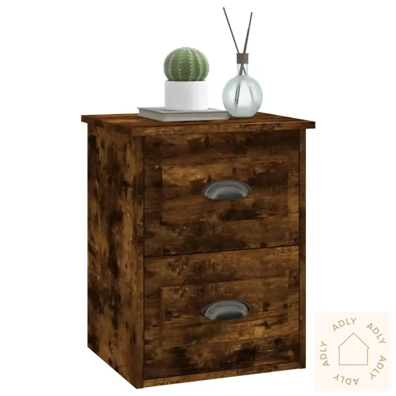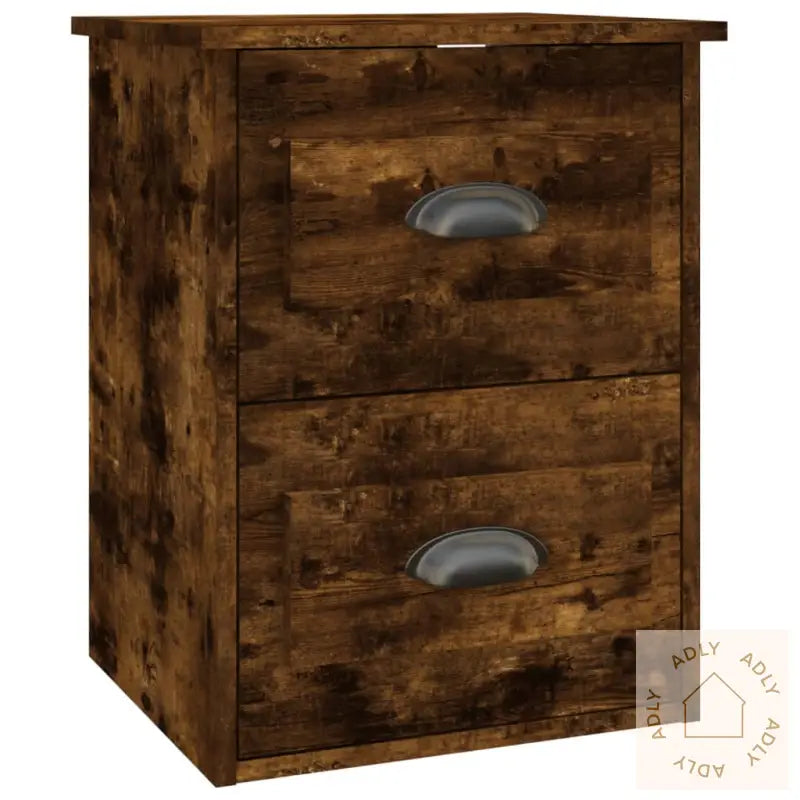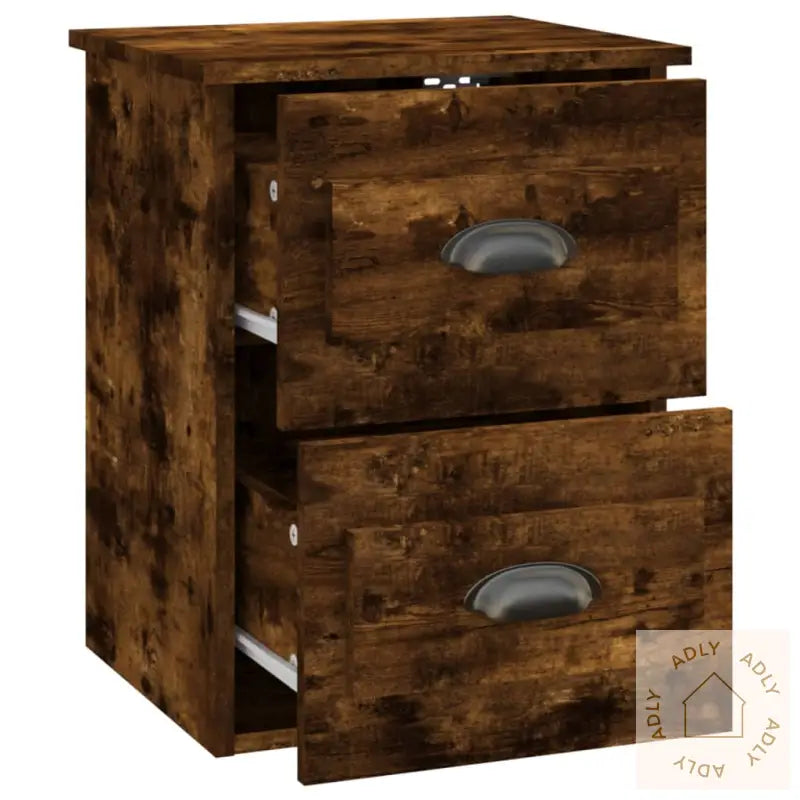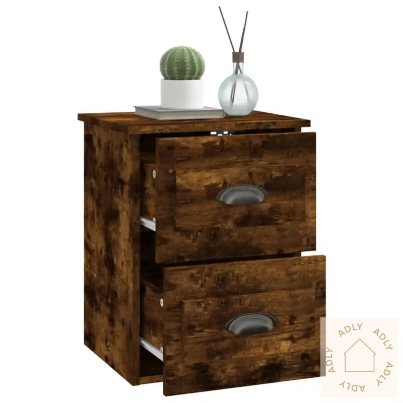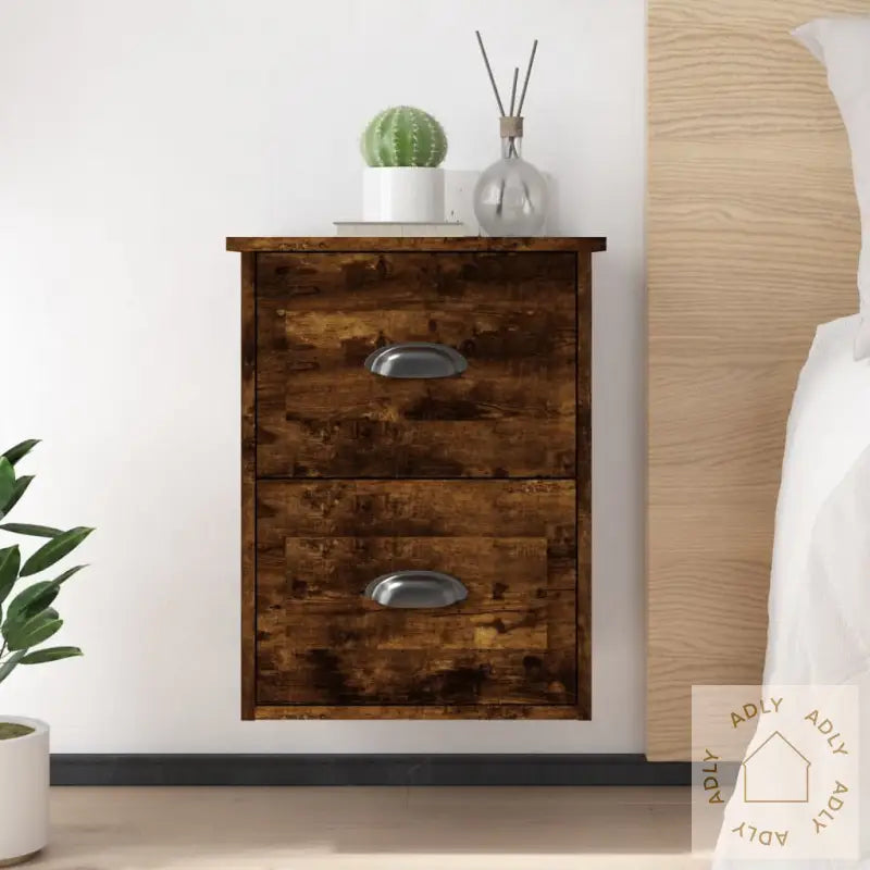 Slitesterkt materiale: Det konstruerte treverket er av høy kvalitet, med en glatt overflate som både ser flott ut og føles solid. Materialet gir god styrke, stabilitet og tåler fuktighet godt, noe som gjør det enkelt å holde nattbordet vedlike.Rikelig med lagringsplass: Det praktiske veggmonterte nattbordet leveres med to romslige skuffer, perfekte for å holde alt du trenger – som bøker, ladere eller andre småting – organisert og lett tilgjengelig rett ved sengen.Veggmontert funksjon: Med den plassbesparende veggmonteringen slipper du at nattbordet tar opp gulvplass. Du kan montere det akkurat i den høyden som passer deg, noe som gir mer frihet i innredningen – og det gjør rengjøring enklere!Stabil og solid bordplate: Den robuste toppen av nattbordet gir en flott plass til dekor, fotorammer, mobil eller grønne planter – så får du en personlig touch og alt du trenger lett tilgjengelig.Godt å vite: