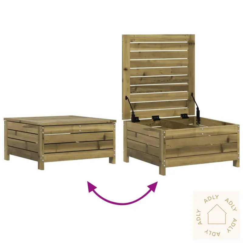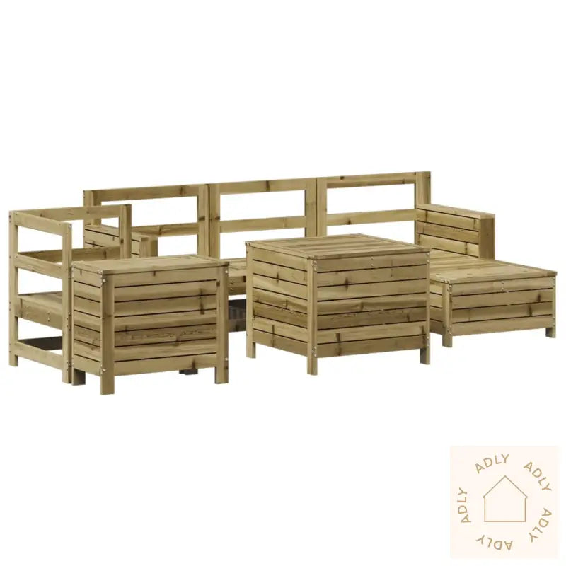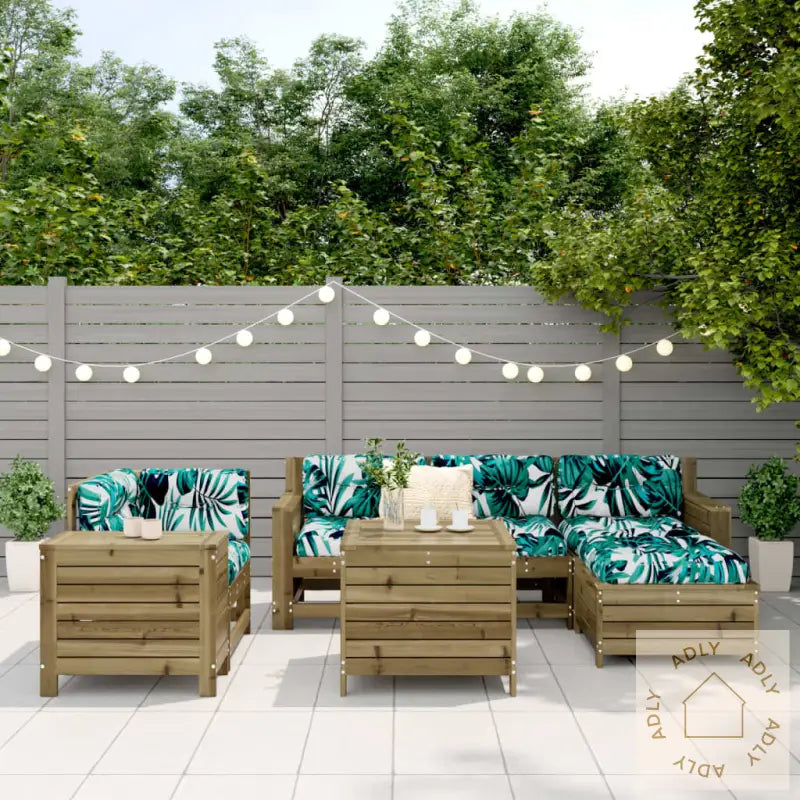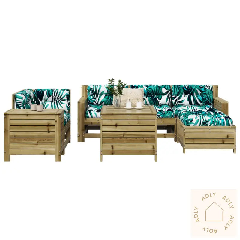 For å holde hagemøblene pene anbefales det å bruke et vanntett trekk når de ikke er i bruk.Materiale: trykkimpregnert furuMateriale lameller: kryssfinerMaksimal lastekapasitet (per sete): 110 kgPute inkludert: neiMontering kreves: jaHjørnesete:Mål: 62 x 62 x 70,5 cm (B x D x H)Mål sete: 60 x 60 cm (B x D)Høyde sete fra bakken: 32 cmMidtsete:Mål: 62 x 62 x 70,5 cm (B x D x H)Mål sete: 60 x 60 cm (B x D)Høyde sete fra bakken: 32 cmSofa med armlener:Mål: 69 x 62 x 70,5 cm (B x D x H)Mål sete: 60 x 60 cm (B x D)Høyde sete fra bakken: 32 cmHøyde armlene fra bakken: 52 cmMål sidebord: 58 x 25 cm (L x B)Mål fotskammel: 62 x 62 x 32 cm (B x D x H)Mål bord: 62 x 62 x 53,5 cm / 62 x 31,5 x 53,5 cm (L x B x H)Leveransen inneholder:1 x Hjørnesete 1 x midtsete 2 x sofaer med armlener 2 x bord 1 x fotskammel