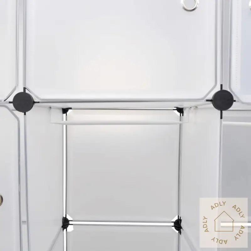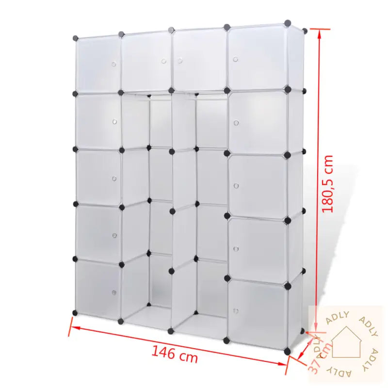 Farge: hvit Mål: 37 x 146 x 180,5 cmMateriale: plastInstruksjoner inkludert14 rom: 12 lukkede rom + 2 åpne hengende romMaks. lastekapasitet (totalt): 15 kgMaks. lastekapasitet per hylle: 3 kgADVARSEL: For å forhindre at produktet velter, må medfølgende festemidler for vegg benyttesLegal Documents: