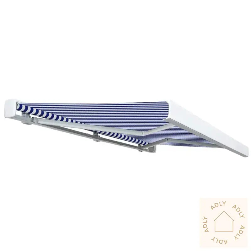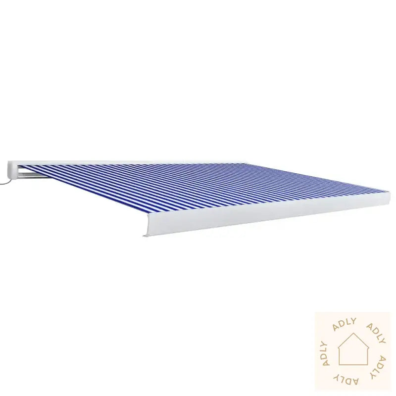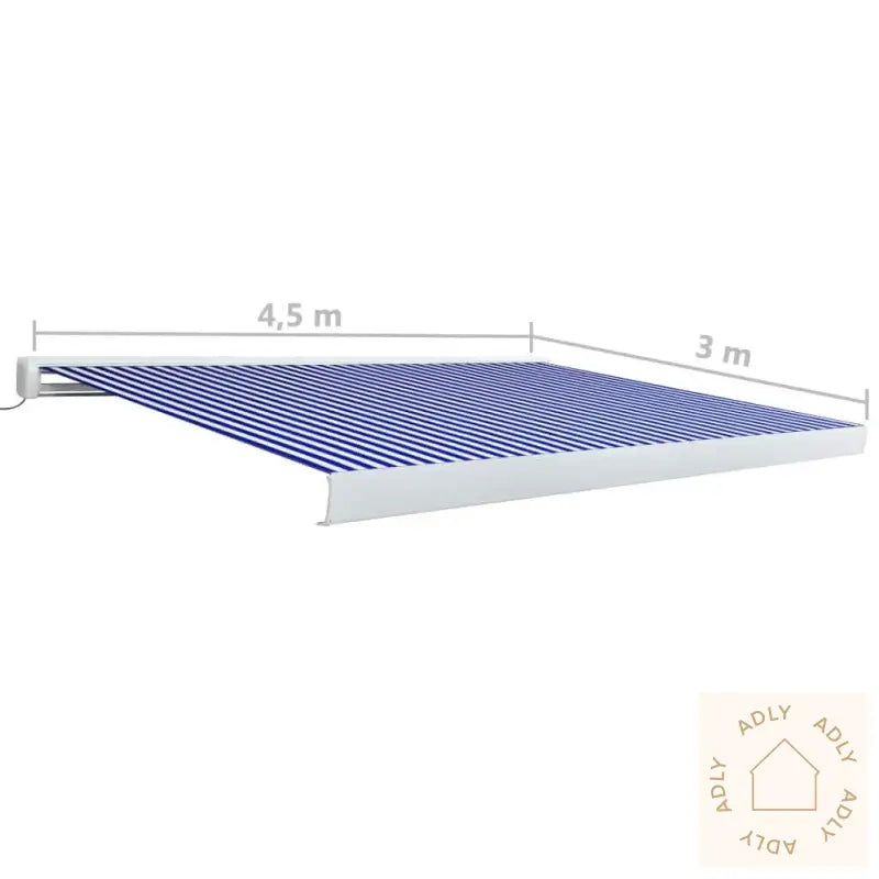Farger: blå og hvitMaterialer: pulverlakkert aluminium, stoff med PU-beleggStoff: 100% polyesterBredde: 450 cmMaksimal projeksjon: 300 cmMed standard veggbraketterMotorisert for enkel åpning og lukkingSpenning: 230V~, 0,95A; 50/60 HzEffekt: 226 WMoment: 40-200 NmHastighet: 13 rpmMontering kreves: ja
