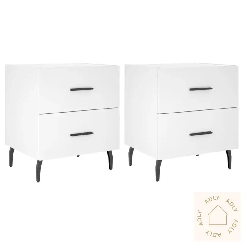 Slitesterkt materiale: Nattbordene er laget av konstruert treverk av høy kvalitet som gir en jevn finish. Dette materialet gir ikke bare styrke og stabilitet, men sørger også for god motstand mot fuktighet. Perfekt hvis du ønsker holdbare møbler som ser bra ut lenge.Romslig oppbevaring: Med praktiske skuffer har du alltid plass til bøker, fjernkontroller, ladere eller andre småting du gjerne vil ha lett tilgjengelig ved sengen. Holder soverommet ryddig og gir deg full oversikt over det du trenger nærmest deg.Visningsfunksjon: Den flate toppen på sideskapet kan brukes til å vise frem bilder av dine kjære, dekorative gjenstander eller friske blomster for å skape en personlig touch i rommet. Perfekt for deg som vil gi ekstra liv til boligen med stilige møbler.Metallføtter: De robuste metallføttene i jern og aluminium gir god stabilitet og tilfører samtidig et moderne, rolig uttrykk til interiøret ditt. Dette gjør nattbordene både pene og solide – en smart kombinasjon i ethvert hjem.Farge: hvitMaterialer: konstruert tre, jern, aluminiumMål: 40 x 35 x 47,5 cm (B x D x H)Montering kreves: jaLeveransen inneholder:2 x nattbord