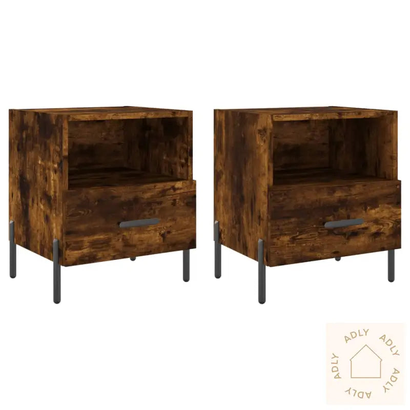 Slitesterkt materiale: Bordene er laget av konstruert tre, kjent for sin eksepsjonelle kvalitet og glatt overflate. Materialet gir ikke bare styrke og stabilitet, men bidrar også til lengre levetid, og tåler daglig bruk samt fuktighet uten problemer.Romslig lagringsplass: Nyt smart og romslig lagringsplass med både en åpen hylle og en praktisk skuff – perfekt for å holde bøker, elektronikk eller andre nødvendigheter lett tilgjengelig og ryddig. Med nok plass til det du trenger, får du enklere organisering på soverommet ditt.Utstillingsmuligheter: Skap en personlig touch ved å plassere bilder, favorittdekorasjoner eller friske blomster på toppen av sideskapet. Slik kan du enkelt gjøre natten enda hyggeligere og skape et innbydende miljø.Metallføtter: Robuste metallføtter gir ikke bare ekstra stabilitet, men løfter også stilen i rommet med sitt delikate, industrielle uttrykk.Farge: Røkt eikMaterialer: Konstruert tre og jernMål: 40 x 35 x 47,5 cm (B x D x H)Montering kreves: JaLeveransen inneholder:2 x nattbordDenne typen møbler til hjemmet er like trendy som de er funksjonelle – og passer supert sammen med både myke senger og annet interiør. La nattbordene bli en nyttig organisasjonsløsning og en dekorativ detalj samtidig. Om du allerede har investert i slitesterke hagemøbler eller utendørsmøbler, vil disse nattbordene gi samme følelse av kvalitet og gjennomført stil innendørs!