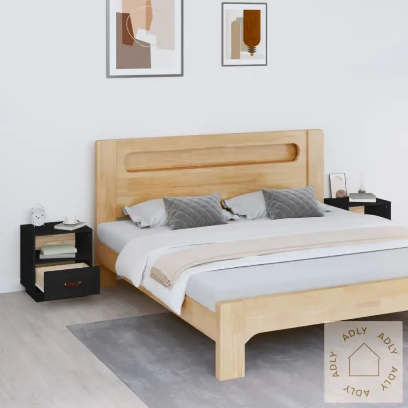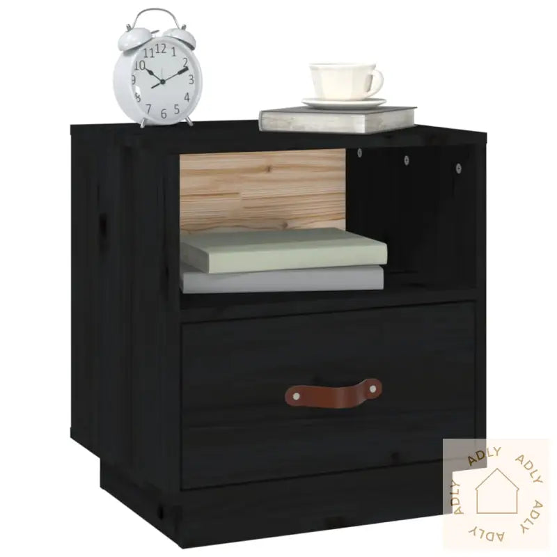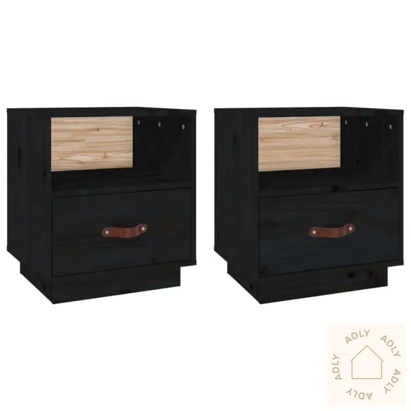 Farge: svartMateriale: heltre furu, kunstig skinn (100 % polyuretan)Mål per nattbord: 40 x 34 x 45 cm (L x B x H)Leveransen inneholder:2 x nattbord